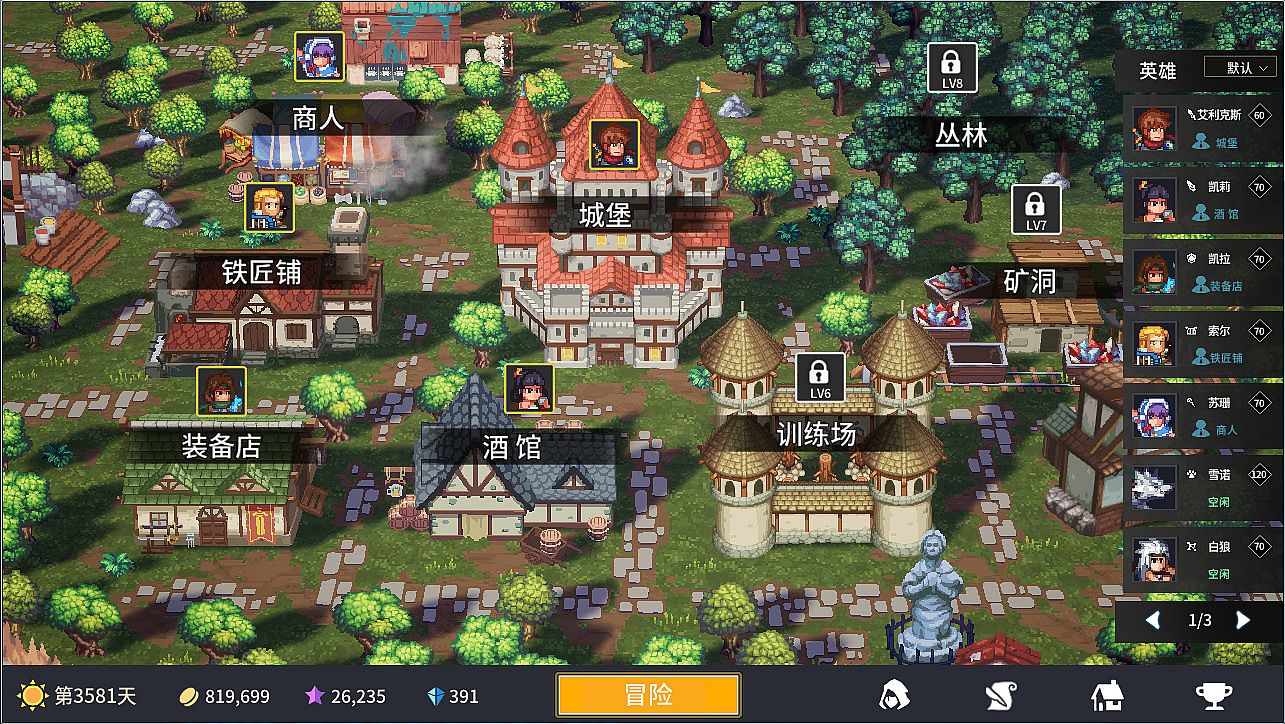 4. Mines-equip your heroes with miners’ work permits and send them to mines. Treasures such as golden pickaxe and miner's hat can double the efficiency of your hero.