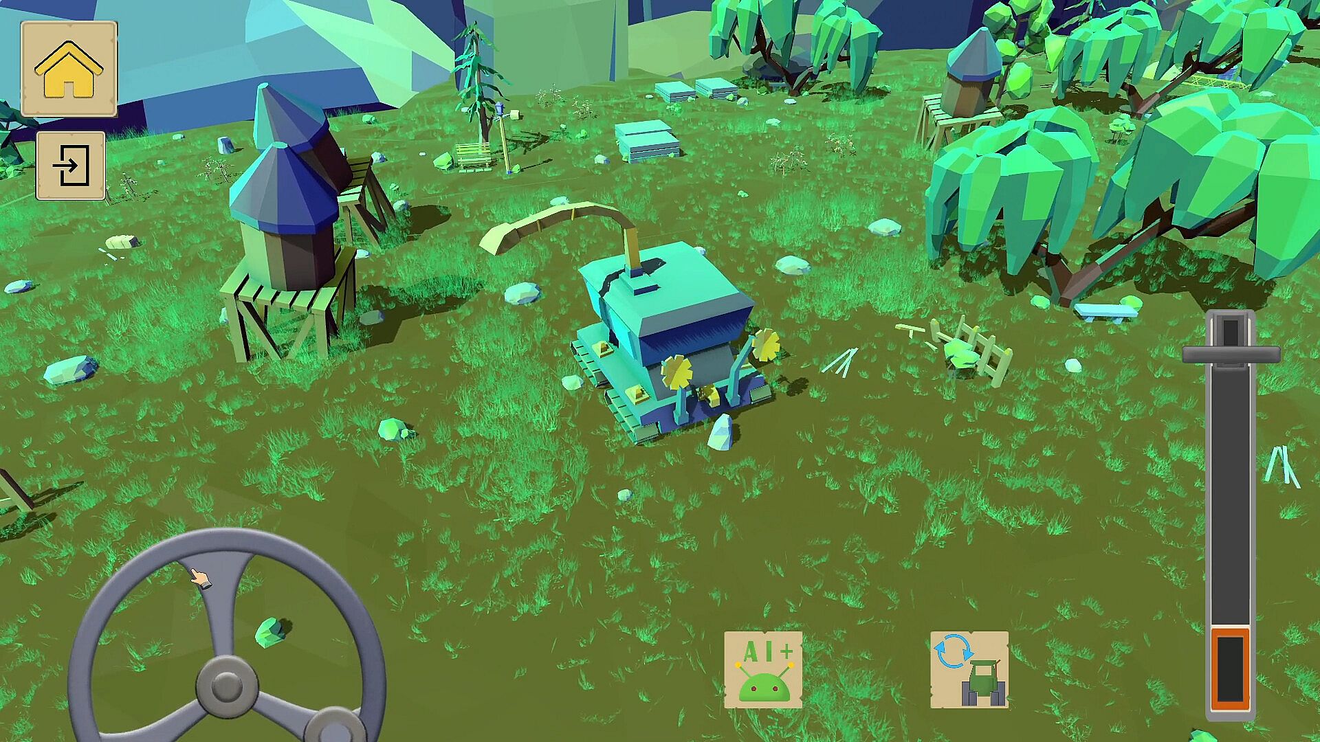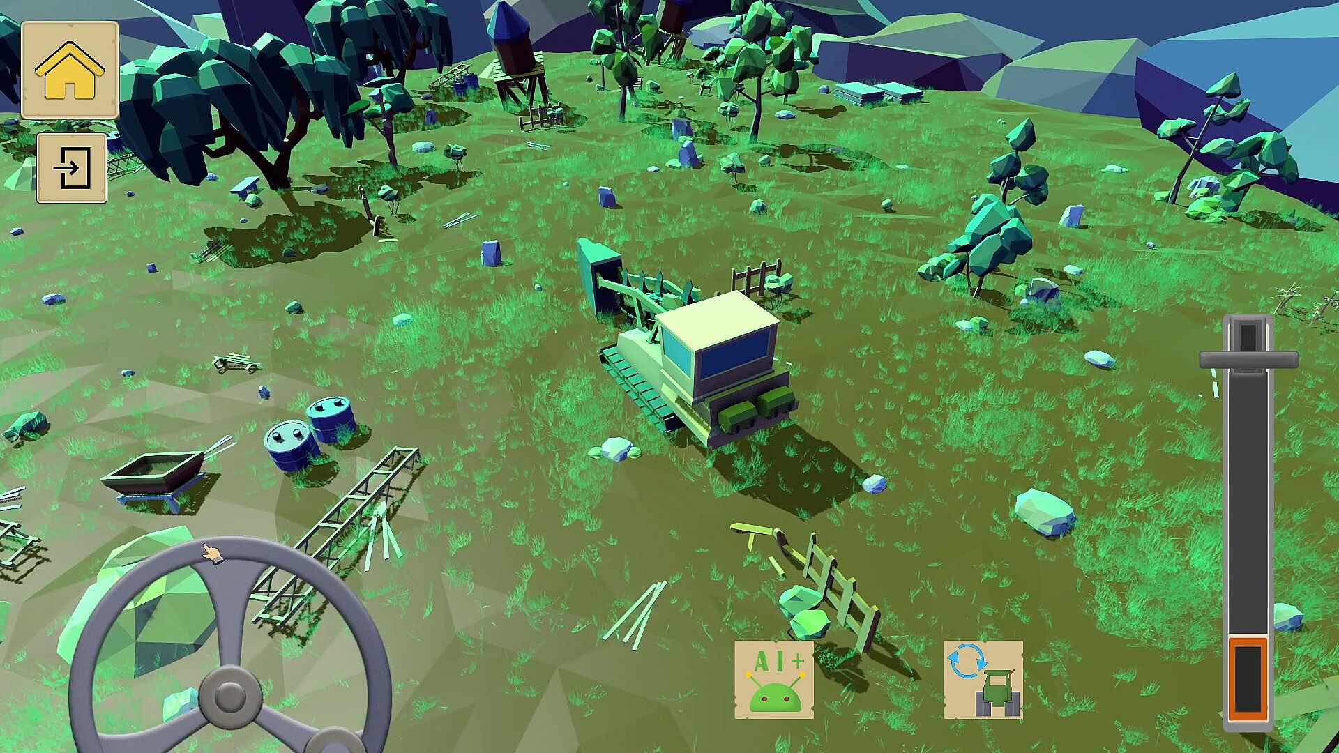 Wake up in your peaceful valley and take control of your farm! Operate machines like tractors, harvesters, loaders, and diggers to plow fields, plant seeds from 10 different crops — from corn to watermelons — and grow your farm step by step. Build and upgrade structures including pig and chicken farms, barns, goat farms, and canopy fuel stations.
