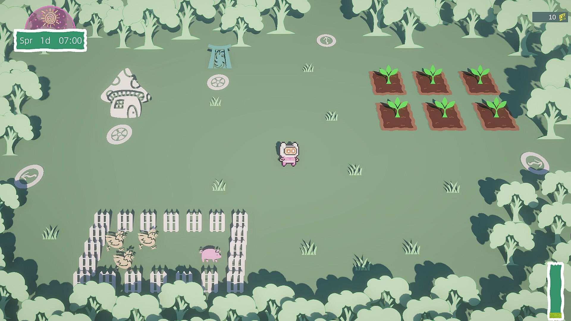 This game is a farming simulation featuring crop cultivation, animal husbandry, exploration, and interactions with NPCs.