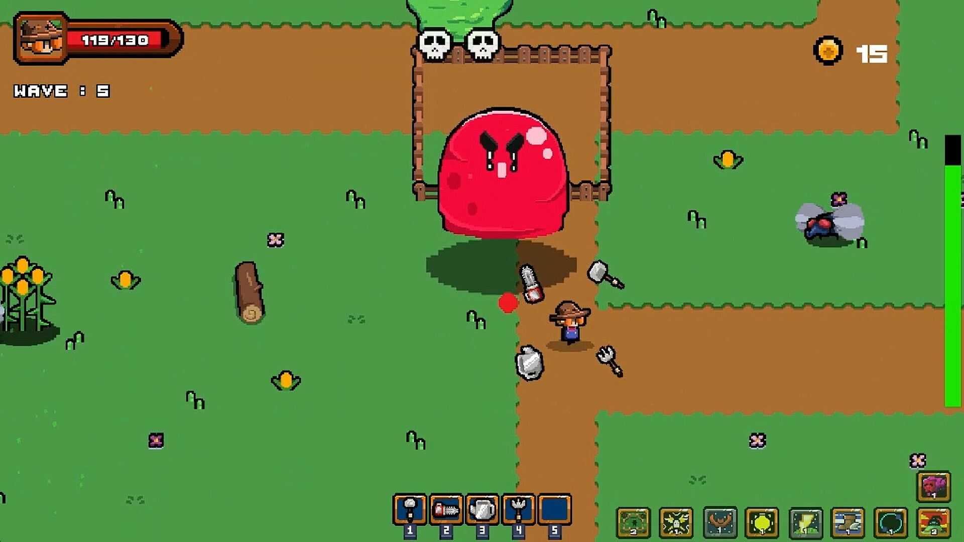 Choose from a variety of weapons, each with unique passives, and discover which suits your playstyle best. Each game is unique, thanks to randomness in the distribution of items and abilities. You never know what surprises the farm holds for you!