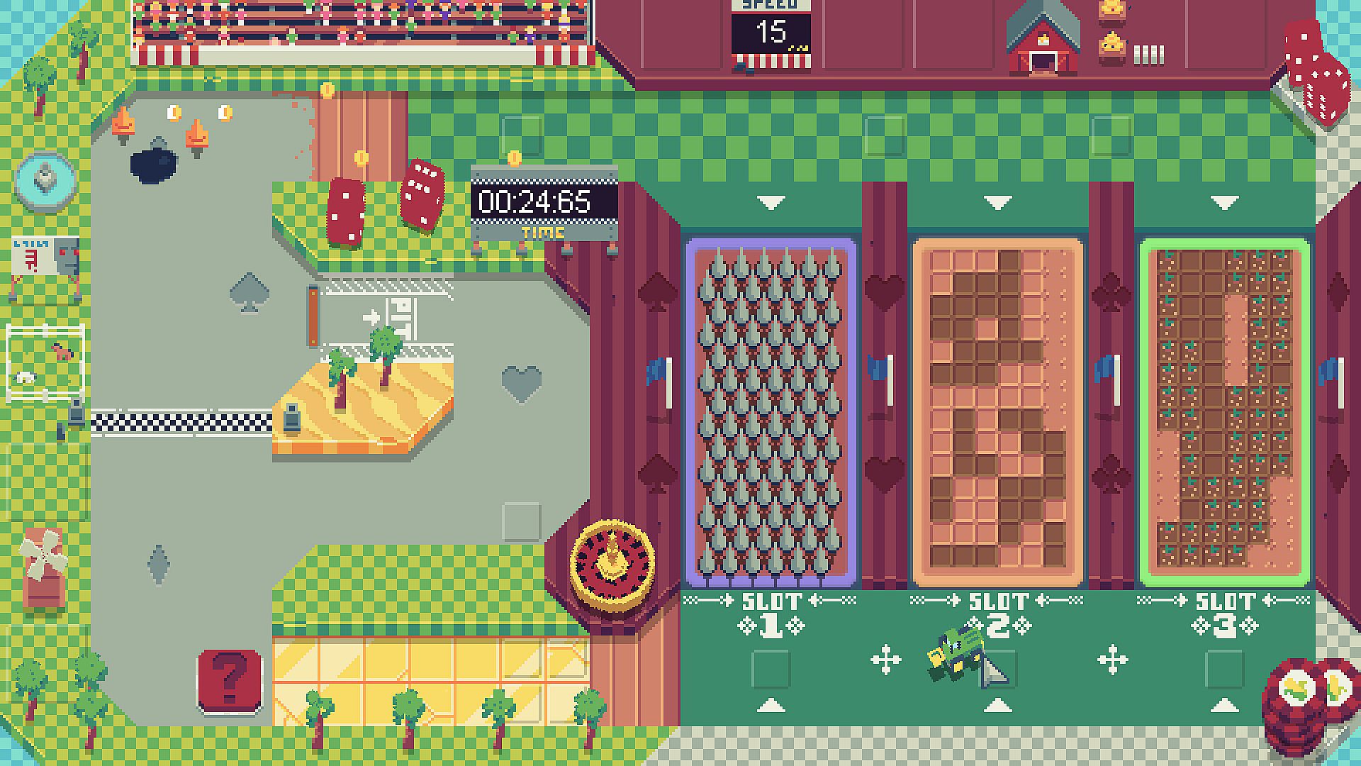 Then you can take those pixely coins and invest them into building your farm or upgrading your vehicles to make them have better speed, turning, and refill their nitro, or buy buildings to earn you more money, more time, bonuses and even build onto the track to make your laps faster!