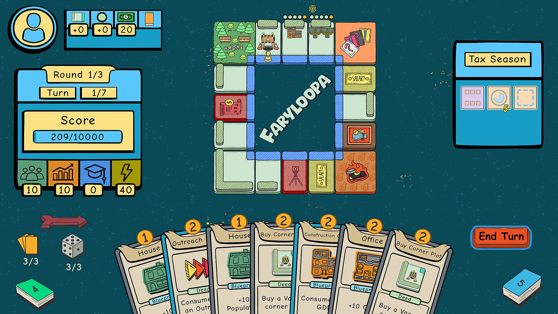 Faryloopa is a roguelike boardbuilder and deckbuilder focused on score chasing and synergy. Build and upgrade your deck and the board itself, roll the dice, move around the board, and push your score high enough to meet each run’s goal.