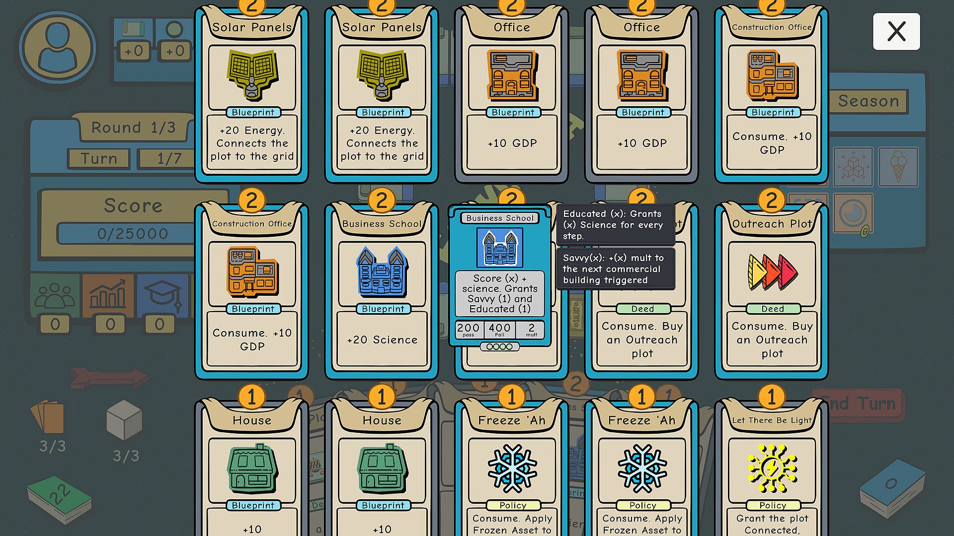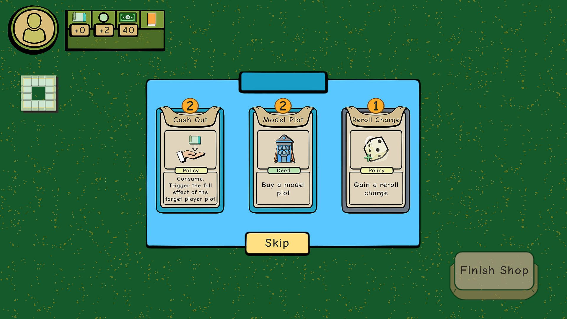 Place plots and buildings using cards or the shop. Every placement matters, buildings must be positioned to synergize with what’s already on the board and with the type of build you’re committing to.