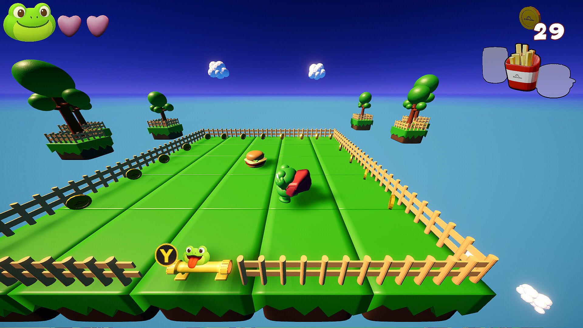 Collect the sacred trio: burger, fries, and soda. Only then will the exit open and let Cururu advance with a happy belly!