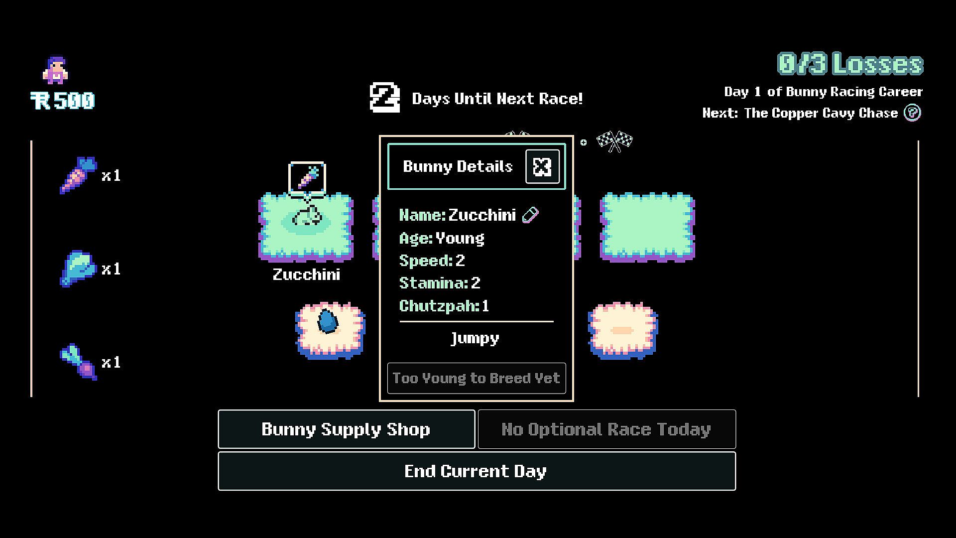 With only a brief period of time before your bunnies are too old to race and retire, you have to budget carefully for different types of food that will raise one of a bunny's three stats. Do you focus on stamina so they can sprint for longer, or go all in on speed - or do you give them more chutzpah, allowing for a bigger boost to their speed when they sprint? Will you go for a balanced approach, or a targeted one?
