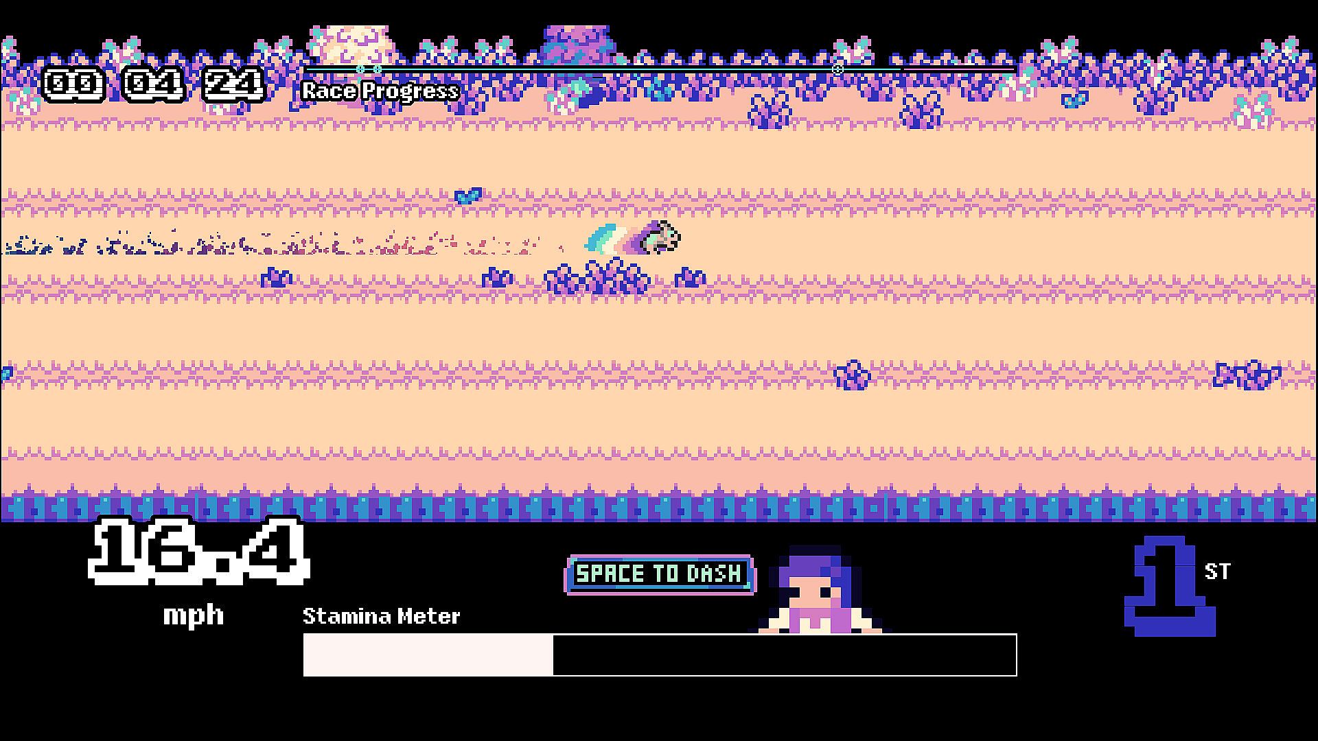 It's up to you to direct your bunny's energy once they hit the track, knowing when to sprint, when to reserve their stamina, and when to go for broke and risk using all their stamina knowing that they'll pass out shortly after you empty their stamina bar!