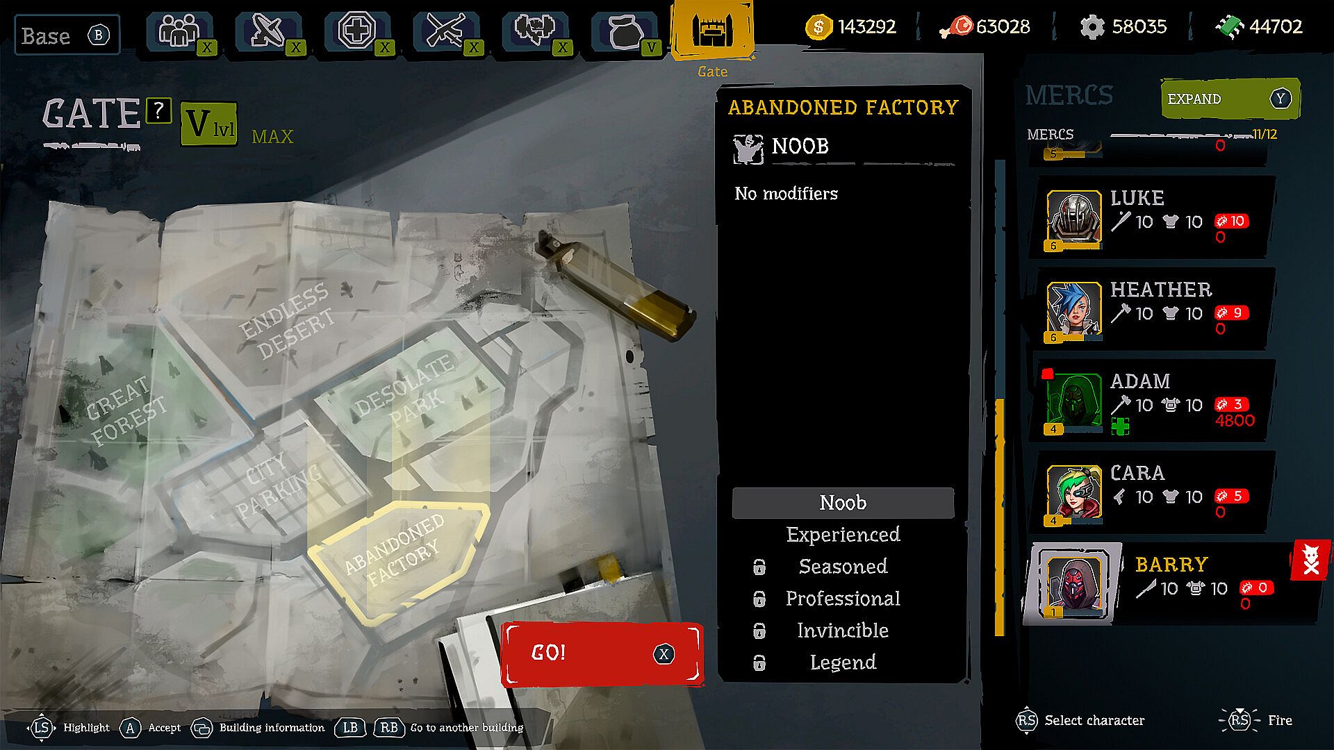 Develop your survivor camp to unlock buffs. Upgrade merc skills in the Training Hall, recruit new mercs at the Mercenary Base, and upgrade your weapons and armor in the workshop. Upgraded buildings increase your chances of survival.