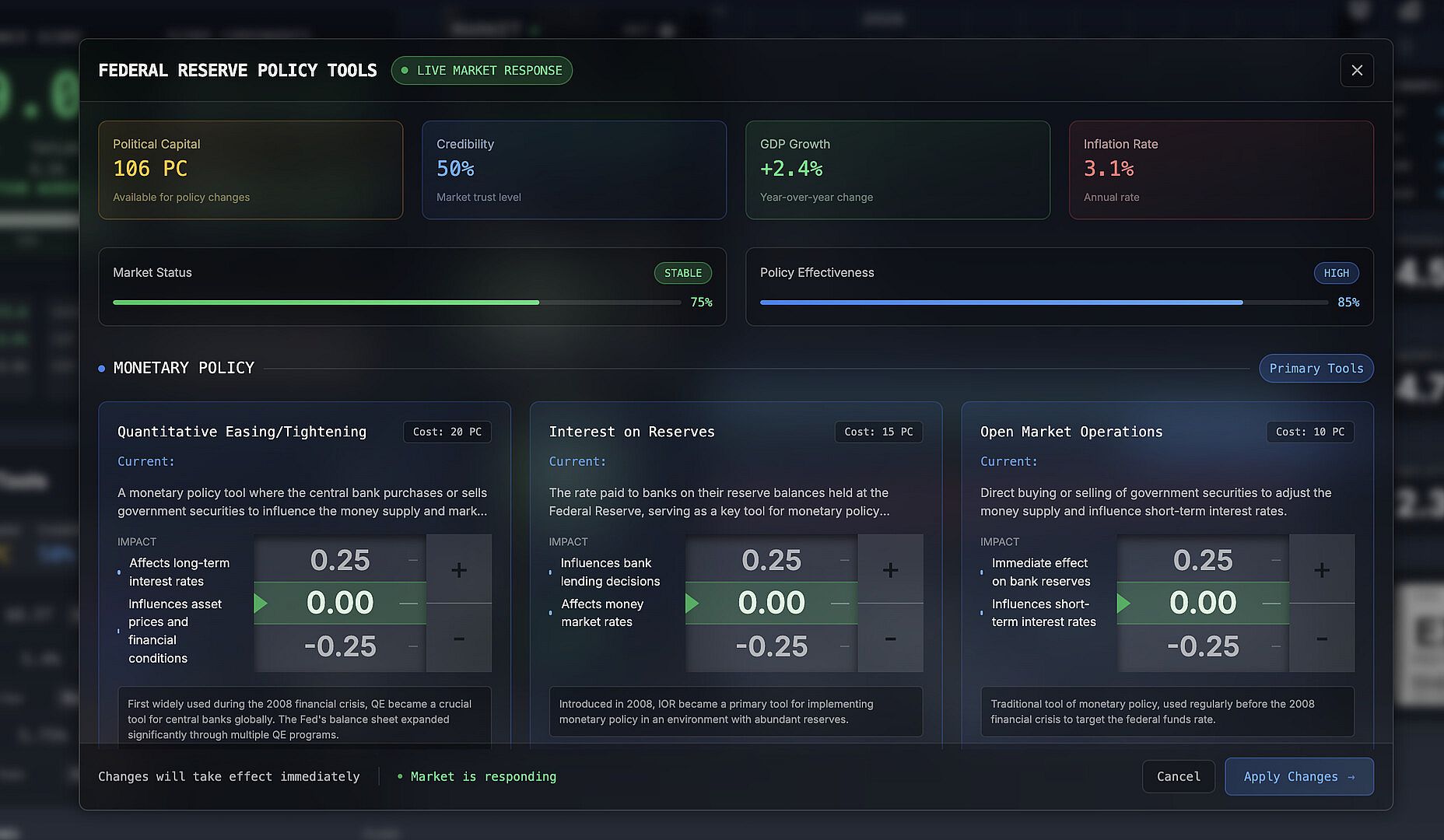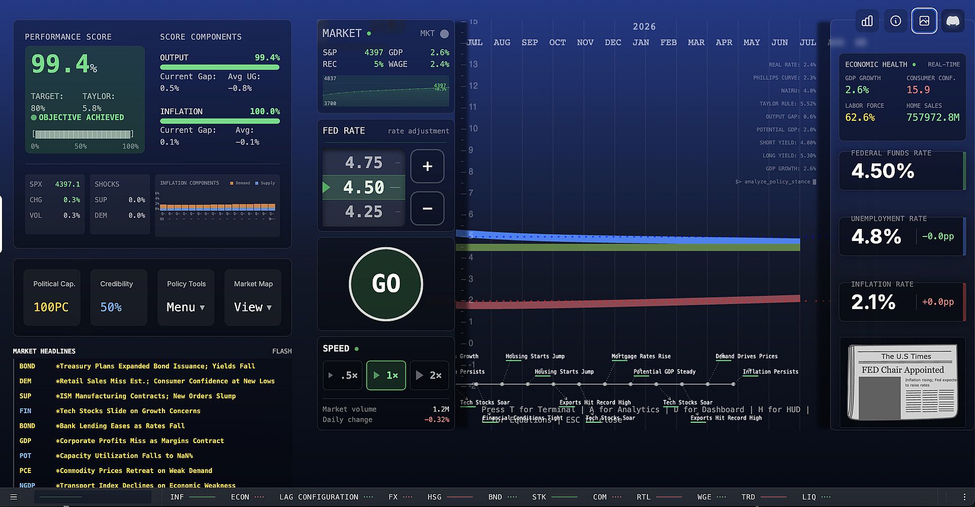 macro-strategy simulator. Raise or cut rates, deploy QE/QT, face surprise