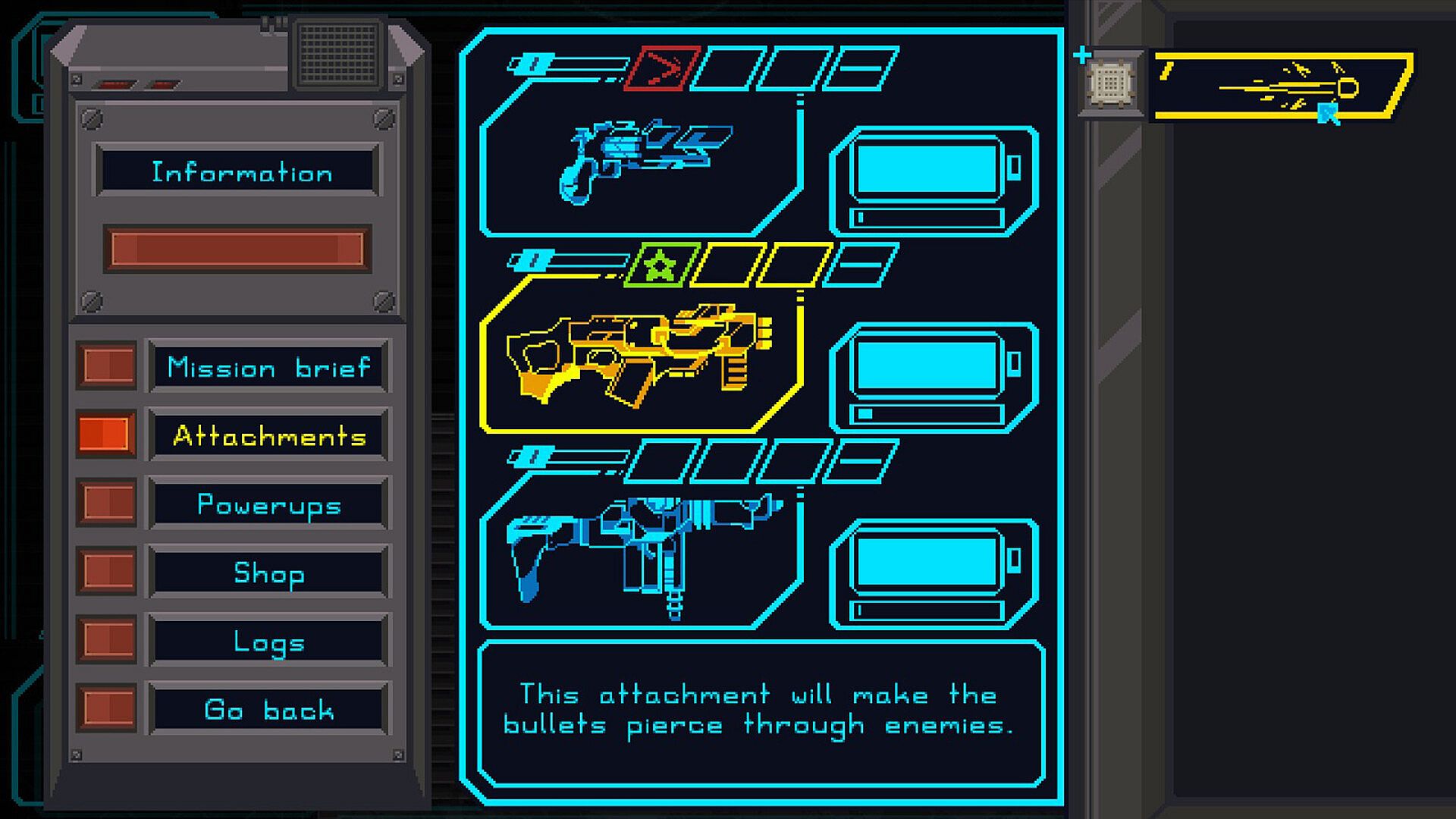 • You will find and buy more pieces as the game goes on, allowing you to upgrade your weapons. Each piece has a special ability, carrying your selected weapon to the next level.