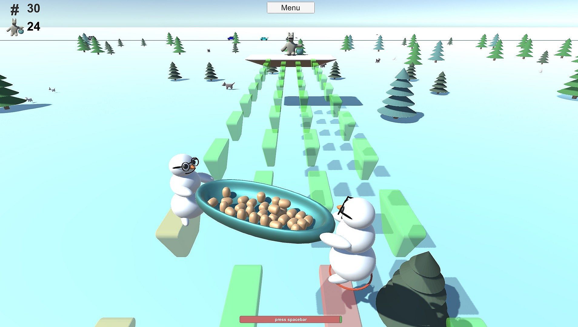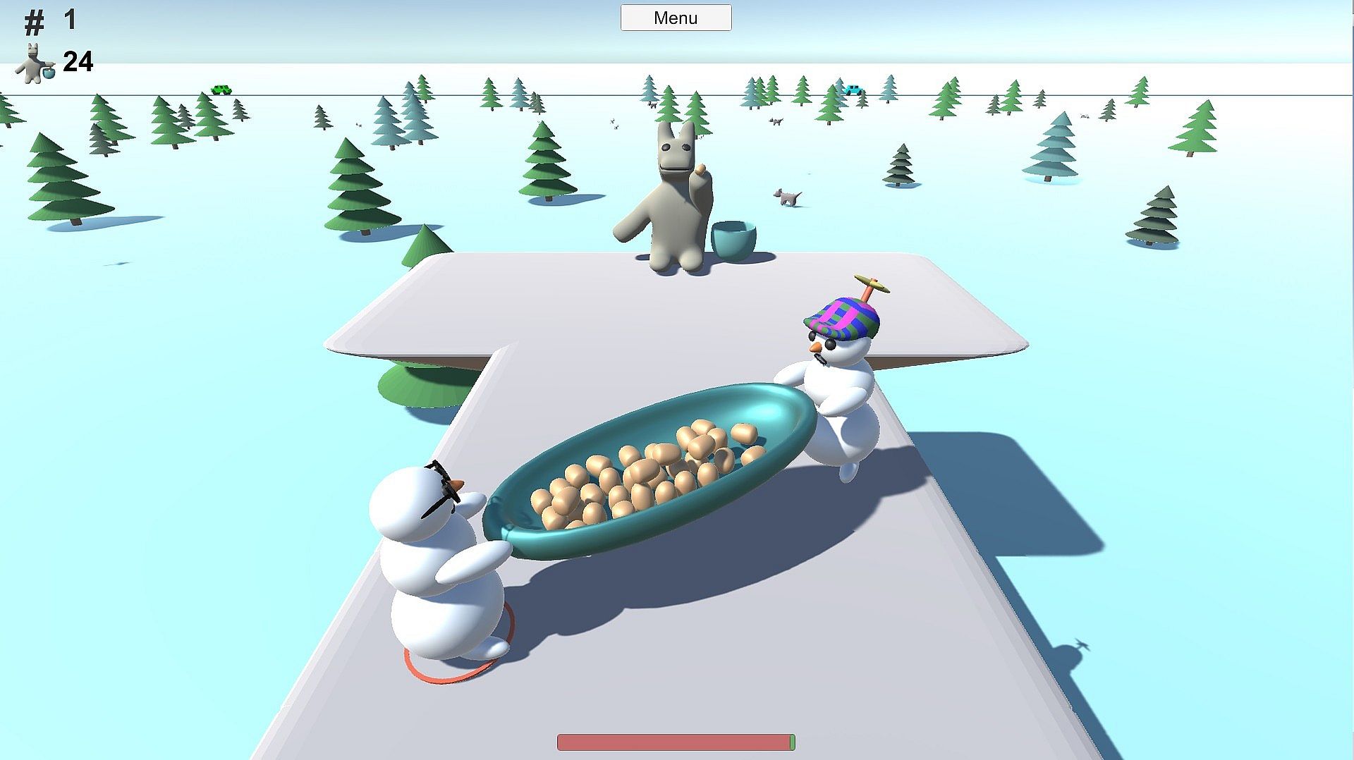 This is a Jump 'n' Jump game. Two snowmen jump with a potato plate from a platform to another. At the end of every level sits a horsebear (horse + bear = horsebear). The snowmen have to take potatoes to horsebear.