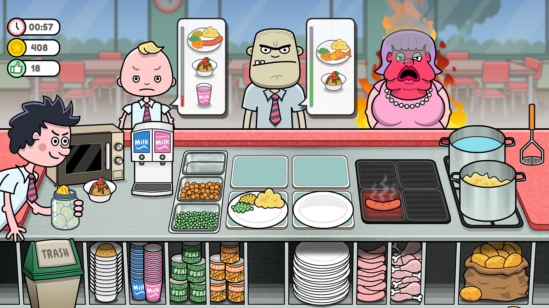 As the newly hired school chef, your job is to serve up tasty meals to hungry students, manage orders, and upgrade your kitchen to survive the growing lunchtime frenzy.