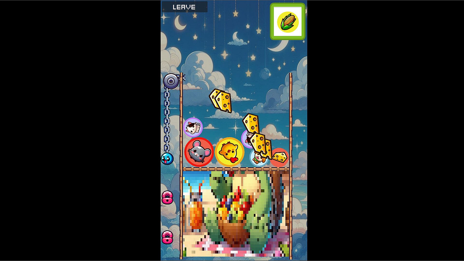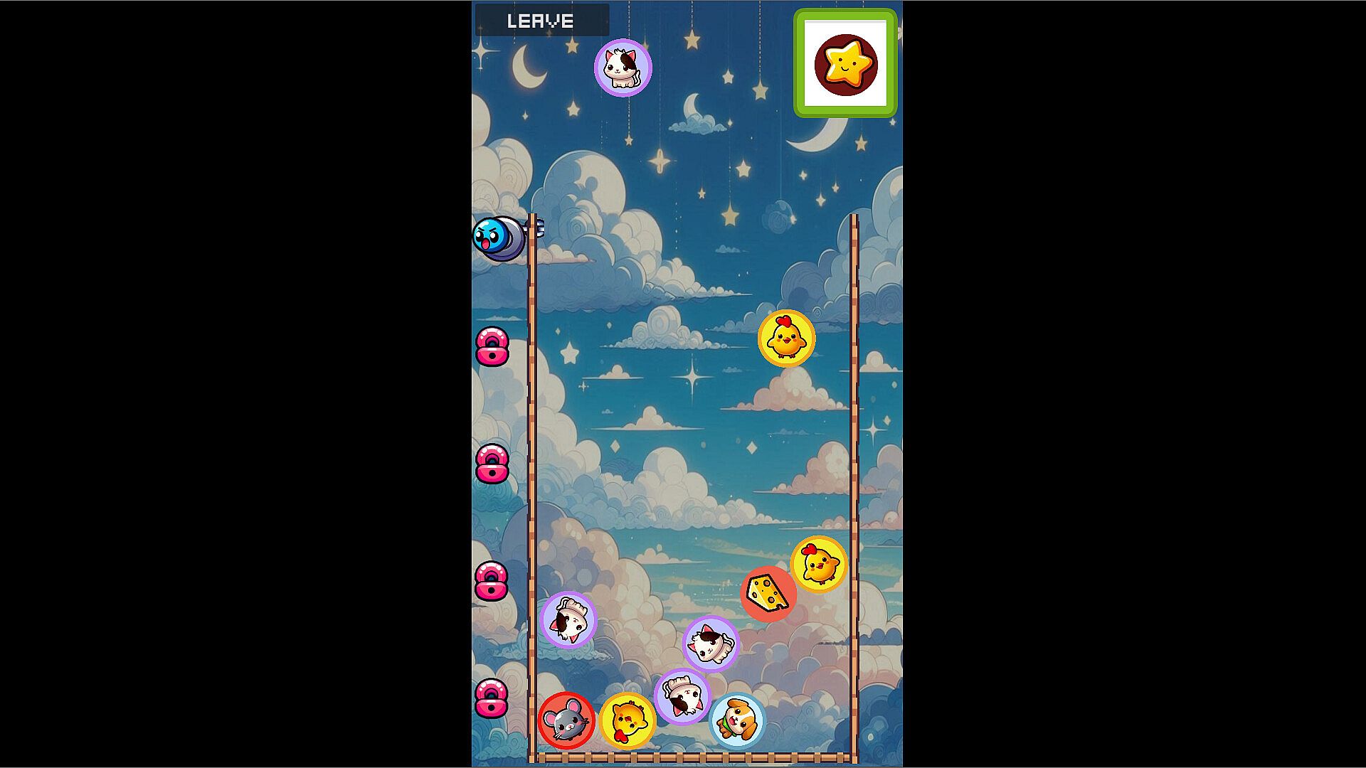 Watch out! If three pieces of the same food touch, they will turn into another hungry animal to feed. Maybe you can use this to your advantage.