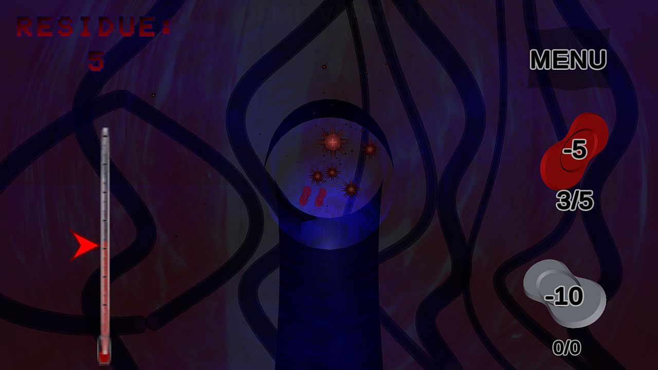 But you are NOT isolated! The immune/circulatory systems of the body have your back! Collect enough "Cellular Residue" from your enemies and you can create White Blood Cells (WBCs) to help you attack the invading forces. Or you can even take direct control of the circulatory system to flush out the foreign entities; your Red Blood Cells (RBCs) will keep the blood flowing and help regulate your body temperature back to an optimum level of YOUR CHOOSING! RBCs can even sweep away certain contaminates giving you more time to take permanent action.