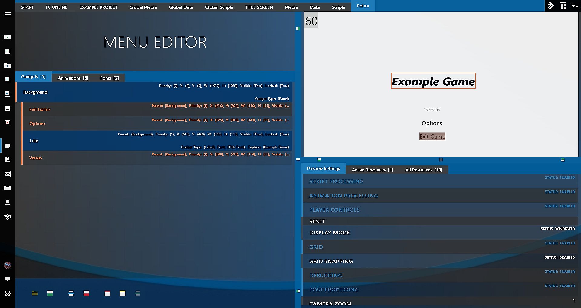 Fighter Creator can scale up or down to any 16:9 display resolution, meaning you can focus on building your games and be assured it will look just they way you want it to at 720p to 4K. You can also setup your games to use different assets depending on the selected resolution.