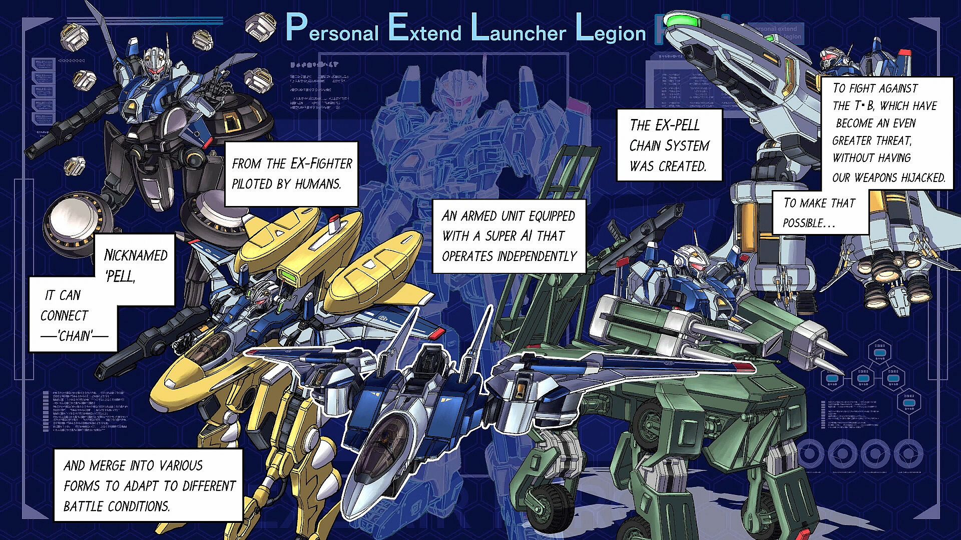 Merging EX Fighter with a PELL unit transforms it into a humanoid robot. The form and performance vary depending on the PELL unit used.