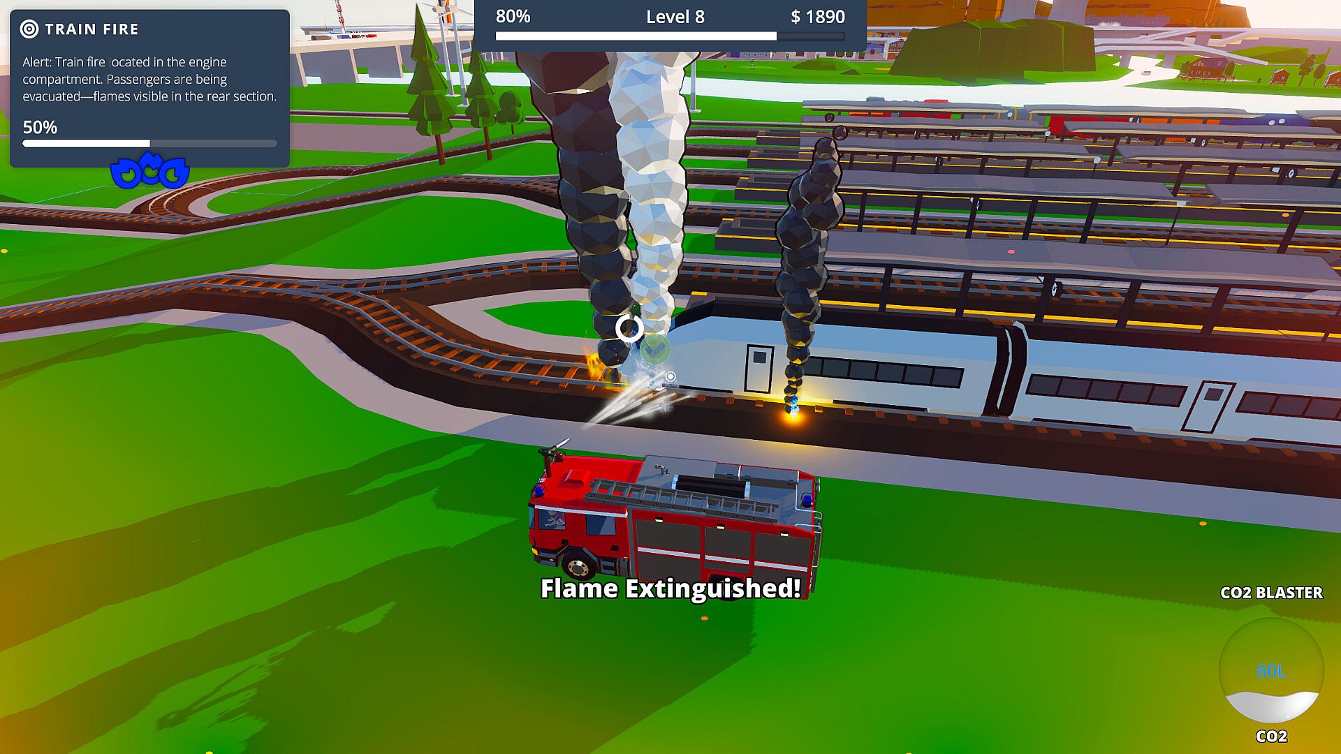 Drive, Upgrade, and Extinguish: Hop in your firetruck, upgrade your gear, and battle raging fires across a vibrant low-poly world.
