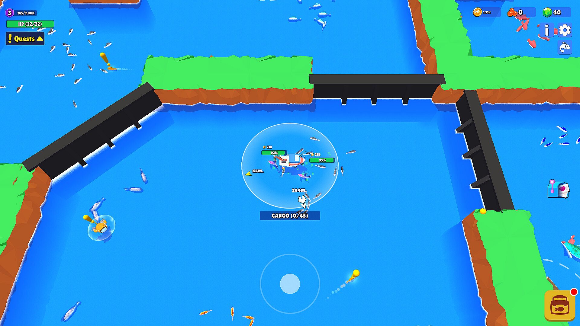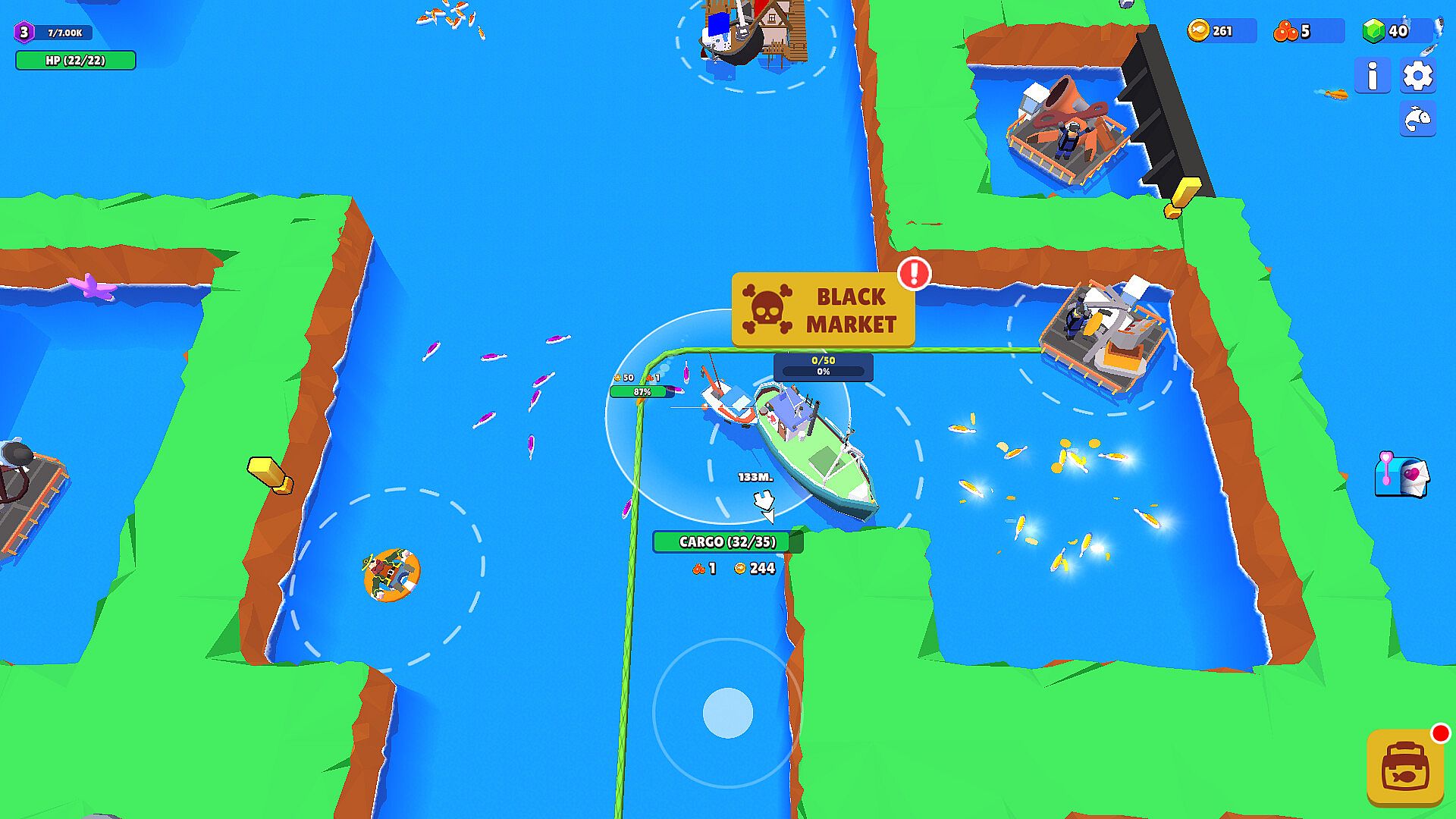 Let’s start with the basics. It’s all about automation: fish start biting as soon as you approach them, and resource indicators keep you informed while you focus on managing your Fish Kingdom effectively. The game offers advantageous upgrades to enhance your idle fishing abilities, helping you become a true fish tycoon. You’ll still need to steer your boat to chase fish schools and avoid obstacles, so don’t get too distracted by your economic prowess!