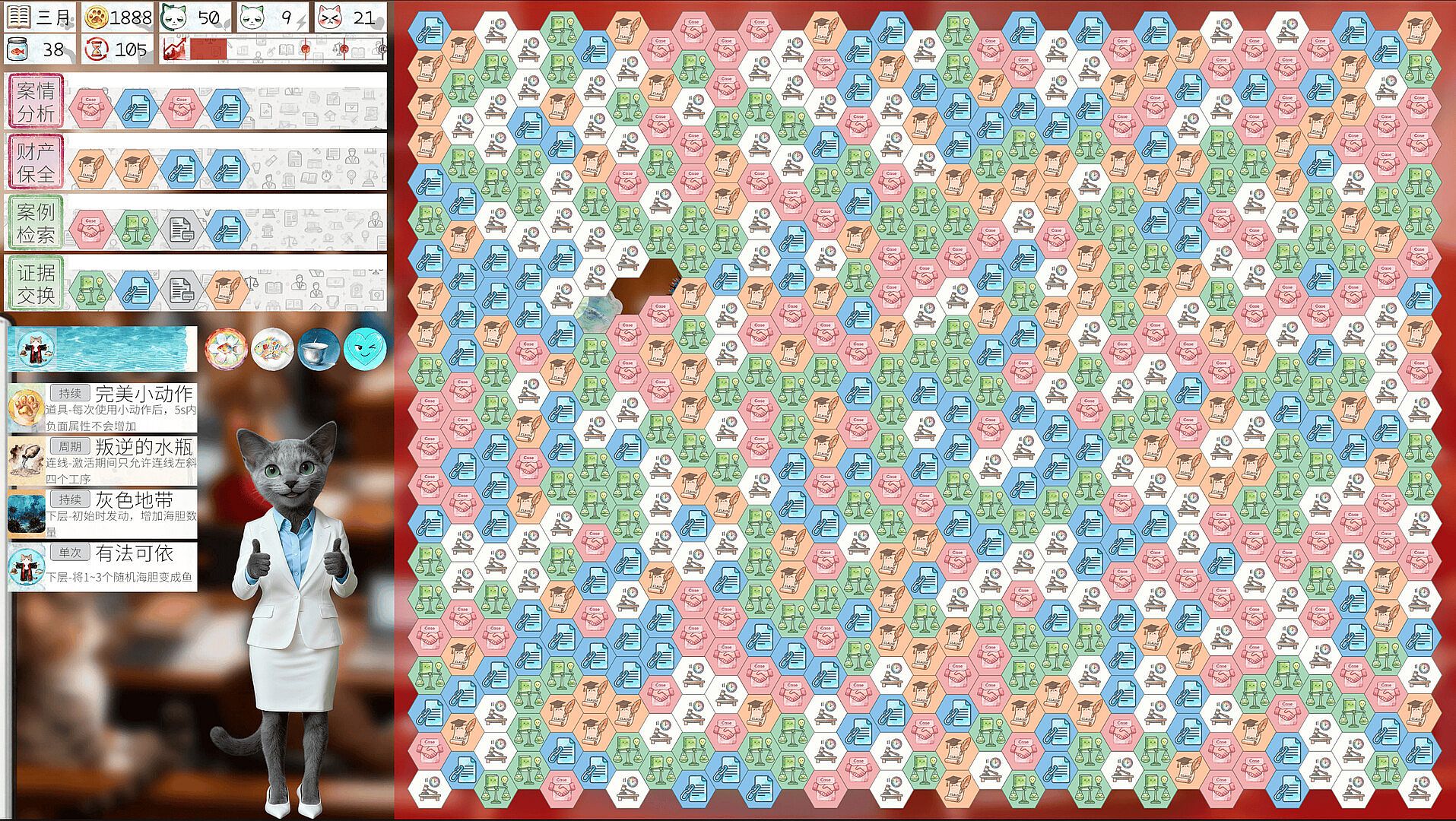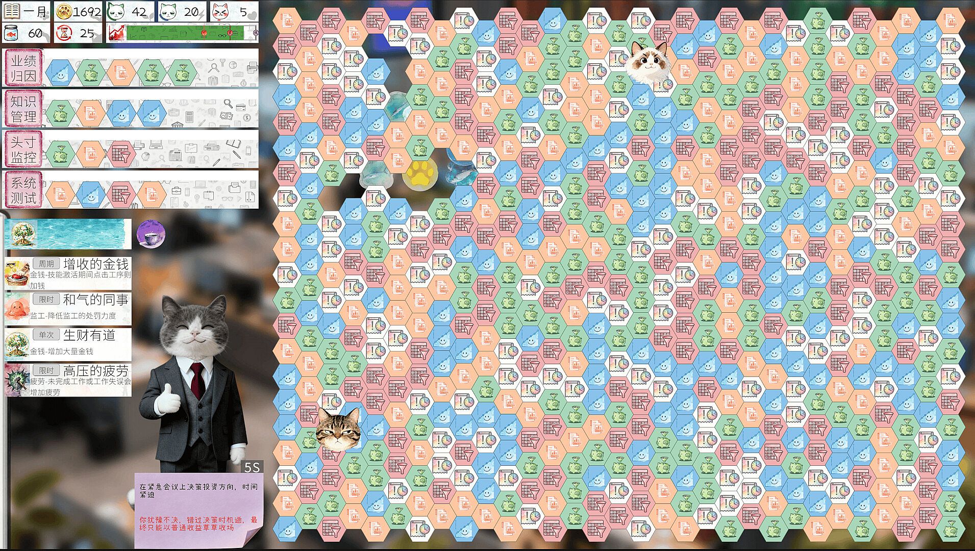 1.#A Workplace System with 200+ Skills & Statuses# Makes work and slacking off more interesting. Each year, you'll experience the professional lives of three different cats, complete challenging job tasks, and counter interference from BOSSes and the Cattle-Horse Deity. Slacking off not only accumulates DHA energy to empower yourself but also activates powerful job skills. Additionally, mechanics like Fidgets, Events, and Sea Urchins make workplace dynamics more flexible and engaging.