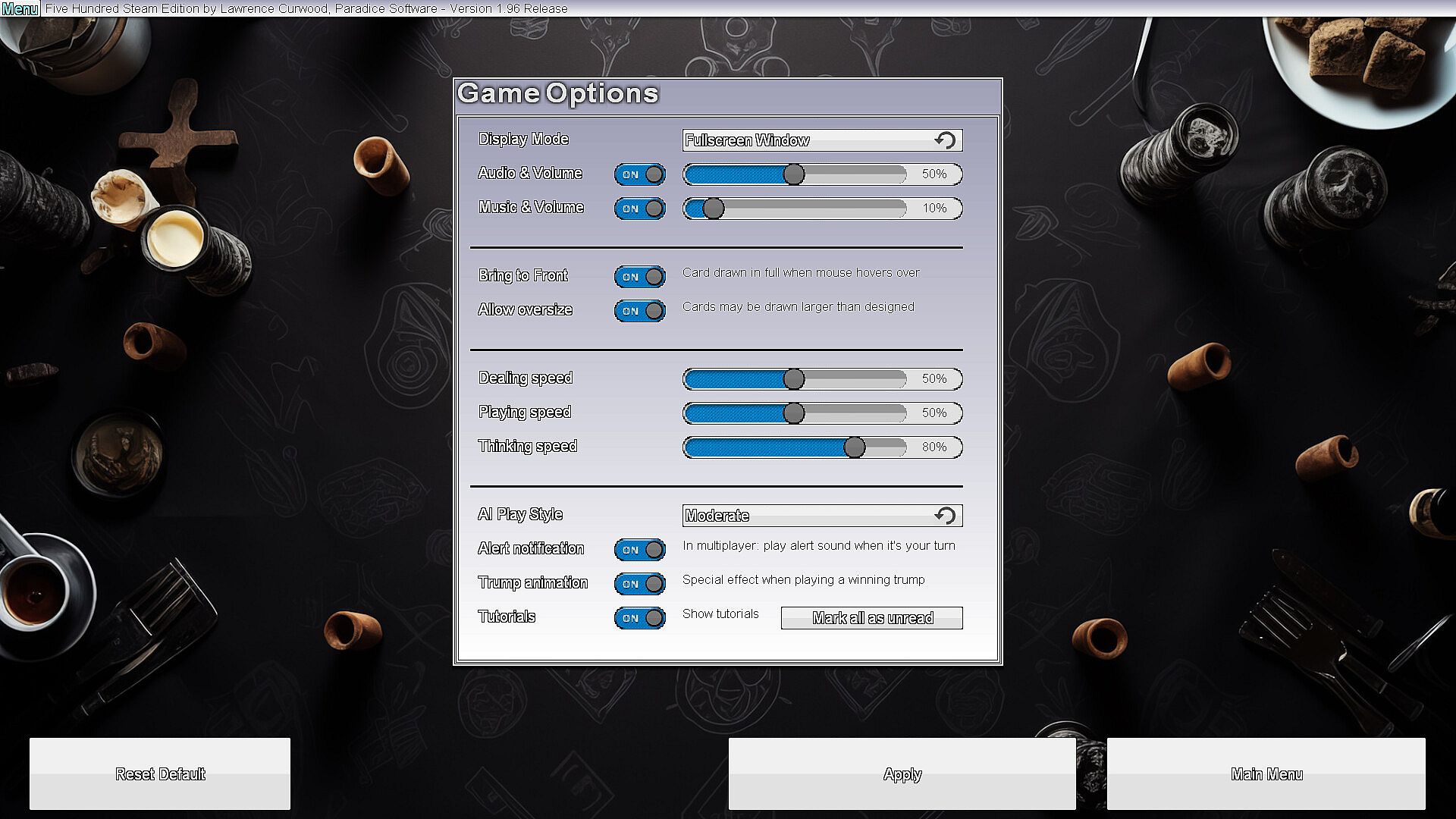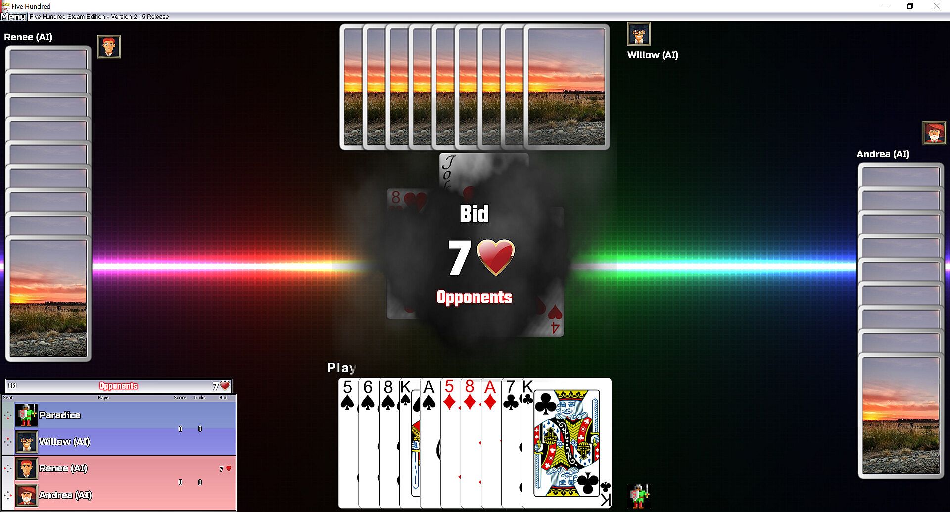 This game has been lovingly crafted to be the best possible version of the game it can be. Coming to steam, the game now takes advantage of multiplayer, achievements, and leaderboards. Support for animated card tables (backdrops) has also been added.However, release is only the beginning! Five Hundred is a game played in homes, workplaces, and clubs around the world, and players may have evolved their own house rules or optimal playstyles. I'm intending to monitor feedback and continue to provide enhancements to features, functionality, and gameplay over time.