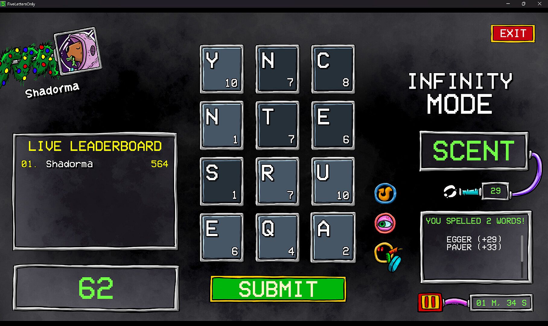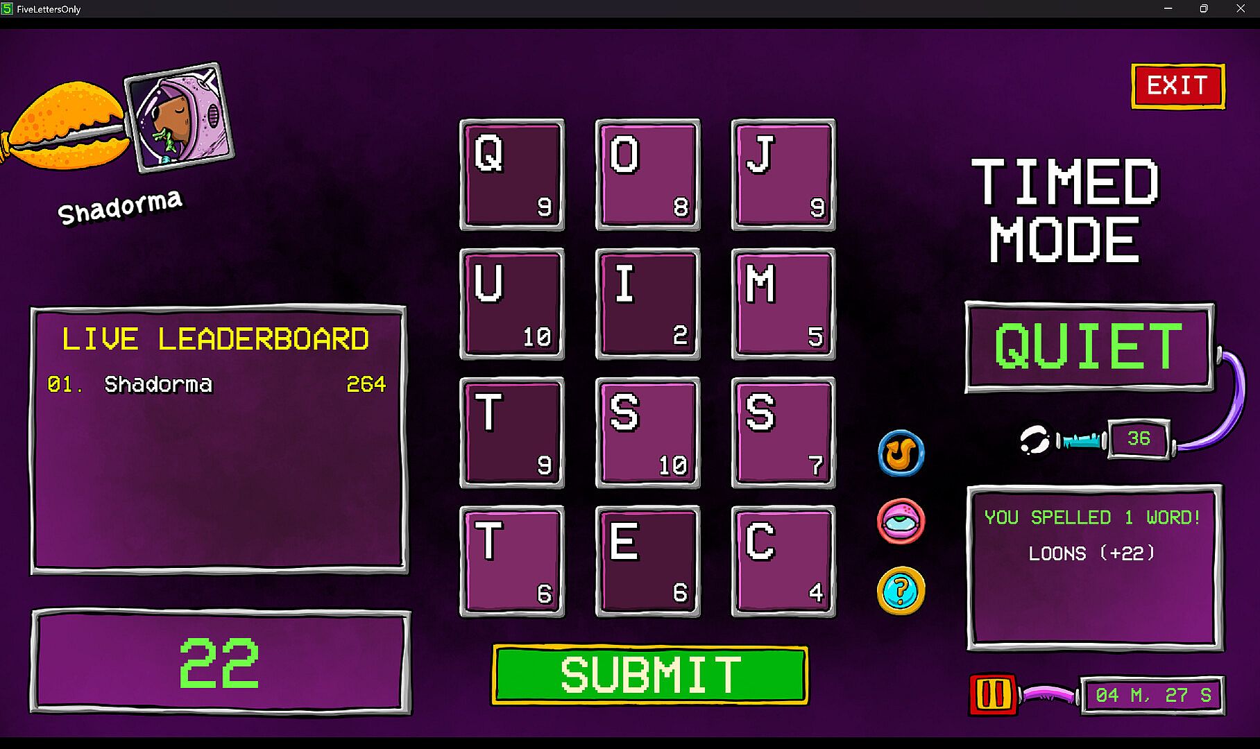 Find high-scoring 5-letter words from 12 random letters. After each word submission, the board refreshes with new letters. The letters are worth random points on each board, making it more challenging to choose your next word. The letters in your word do not need to be adjacent to each other on the board, which gives you the chance to look for the highest scoring letters for your word.