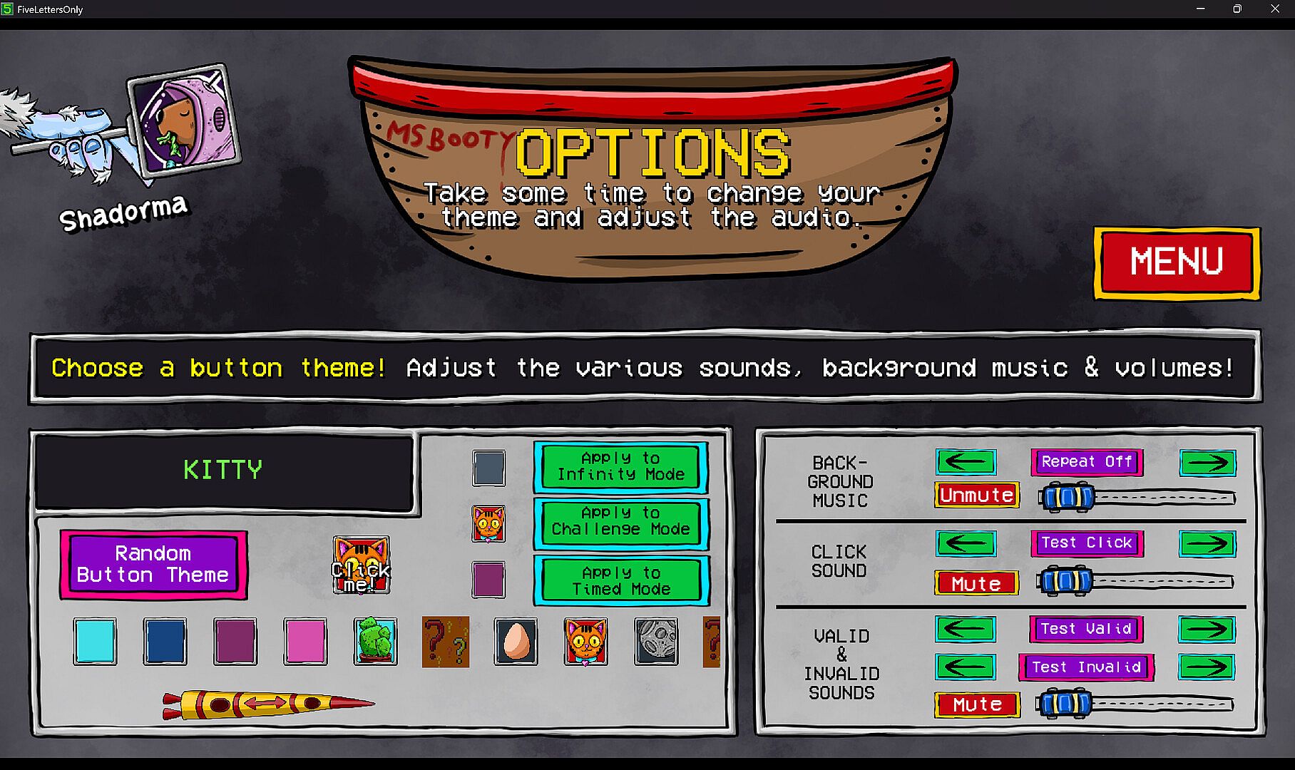 The Options page has all you need to choose a theme, adjust/mute your background music, click sounds and audio validation sounds.