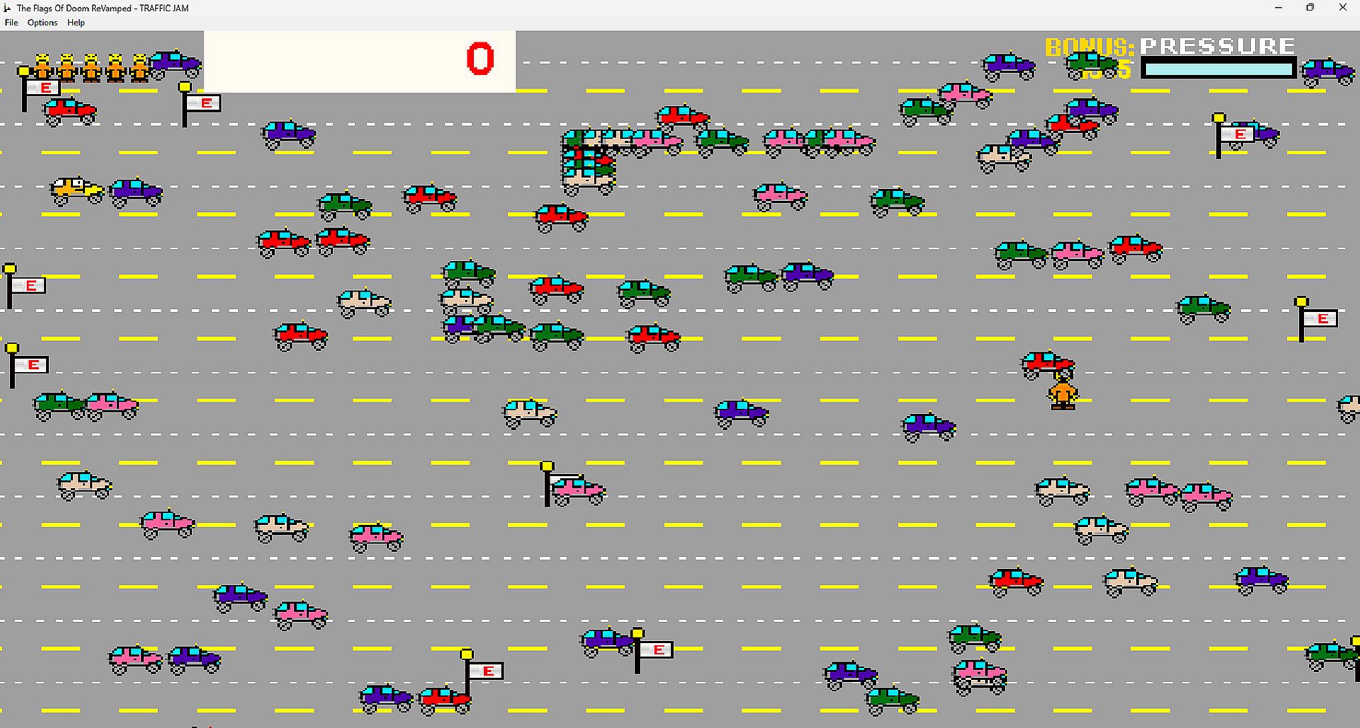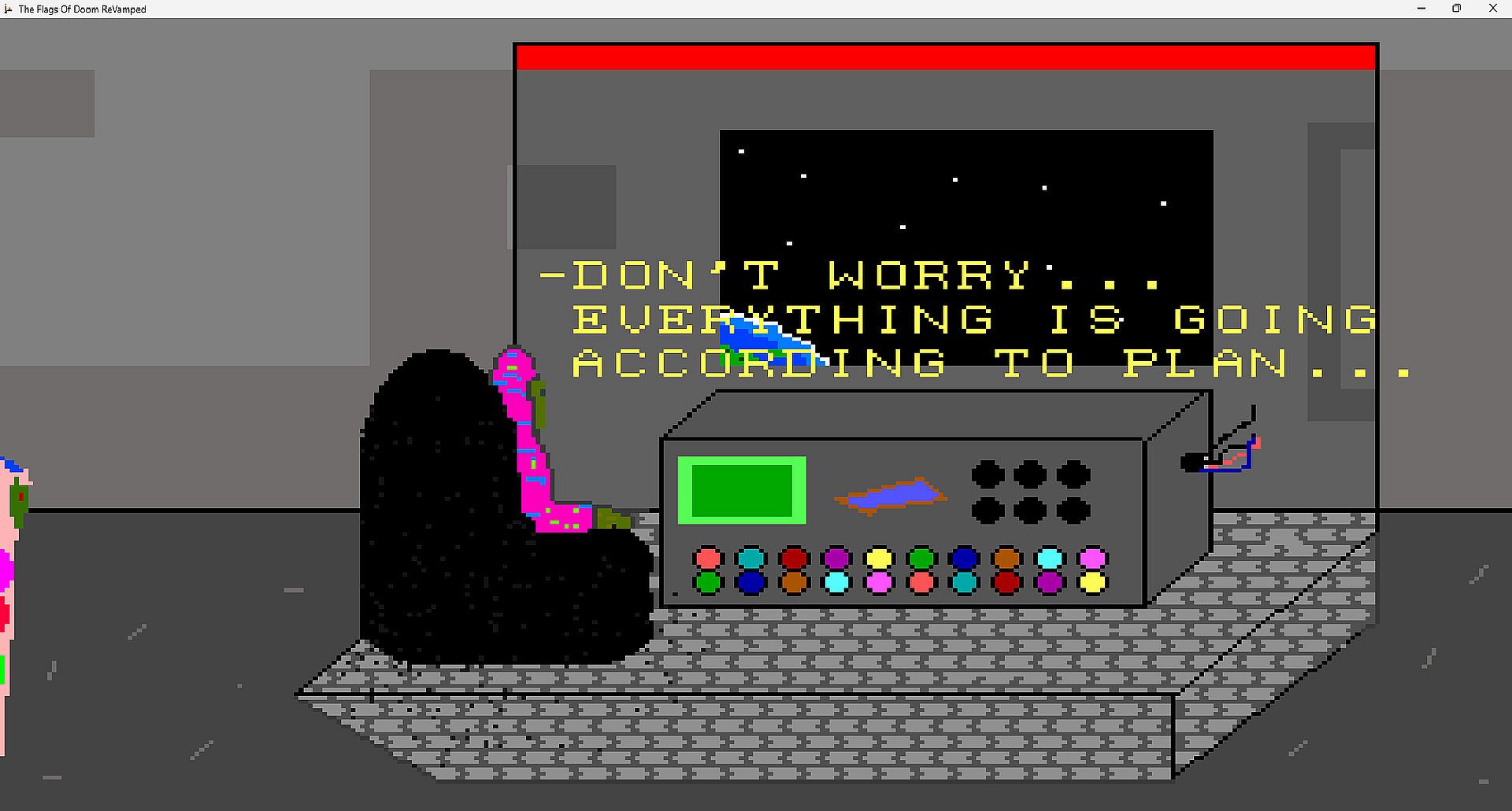 Flags of Doom is a classic 1-screen retro platformer, with a few puzzles baked in. You are Ed, the 3rd or 4th last hope of planet Happyville. You must destroy the evil Space Fish by placing hundreds of tiny bombs over 100-120 stages of increasing difficulty.