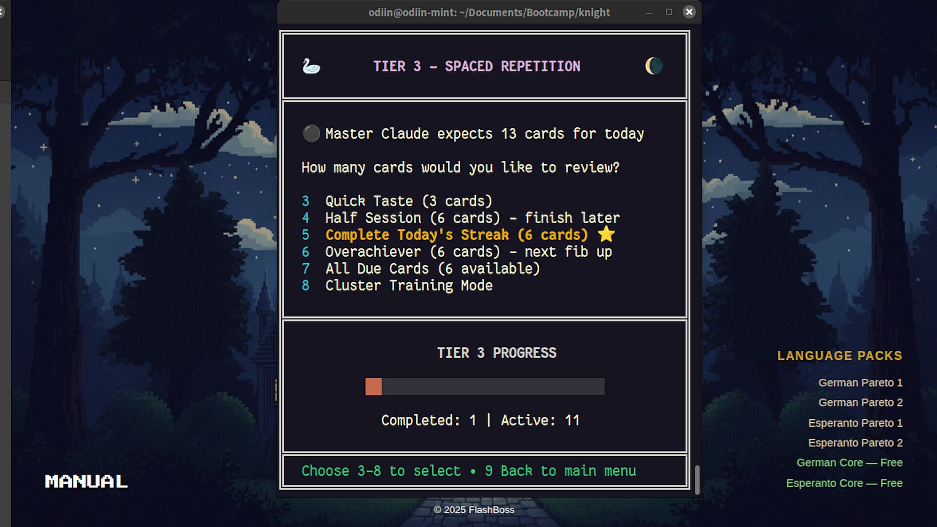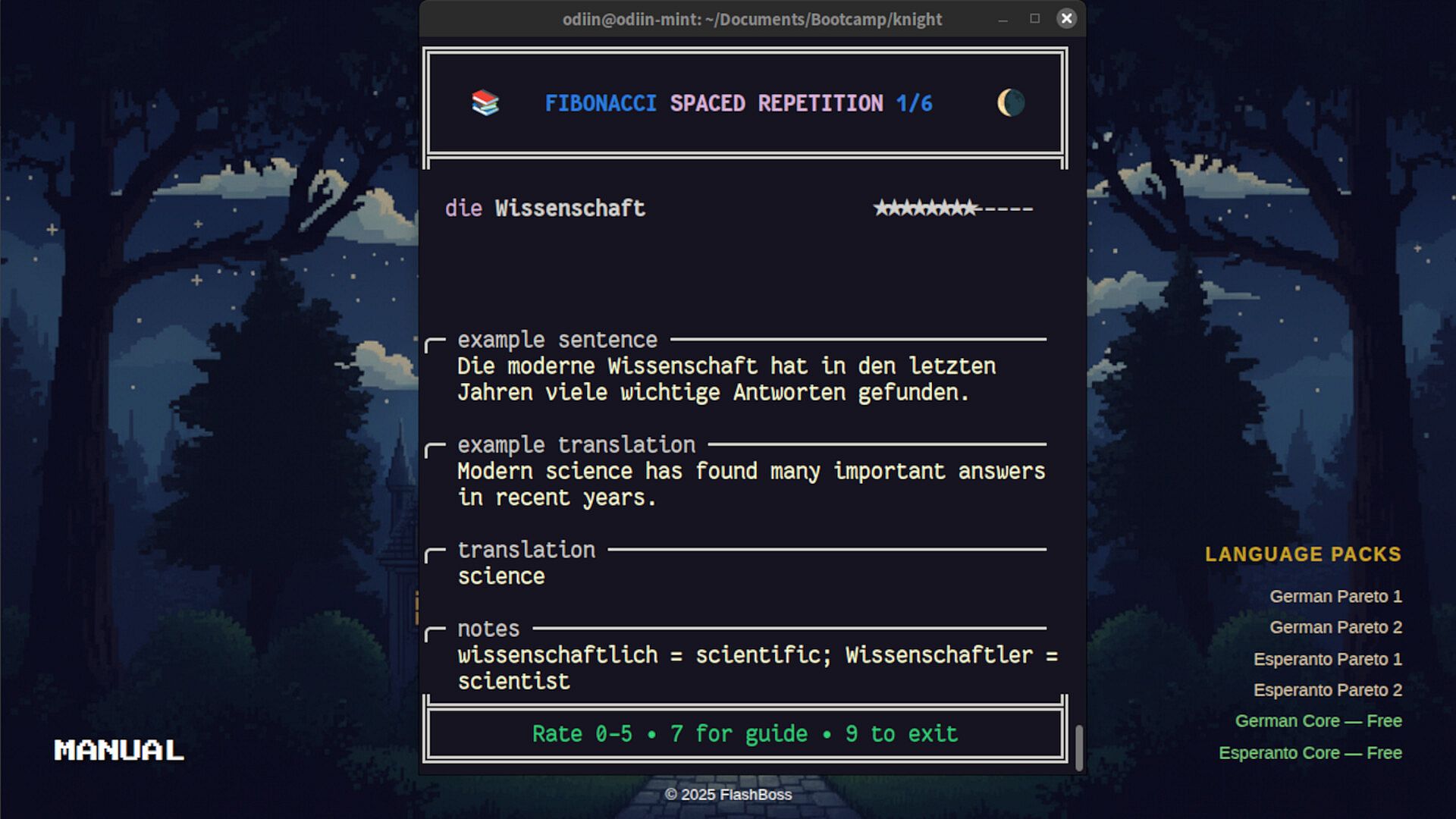 FlashBoss runs in a terminal for that retro aesthetic and lightweight footprint. Language education shouldn't require expensive equipment.