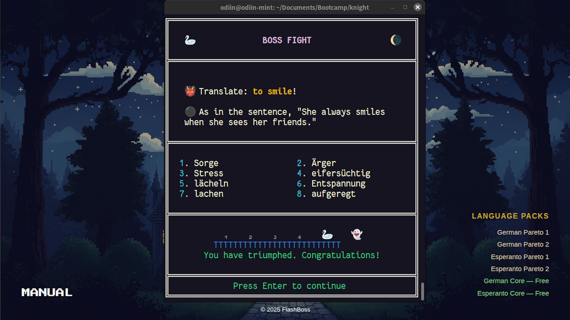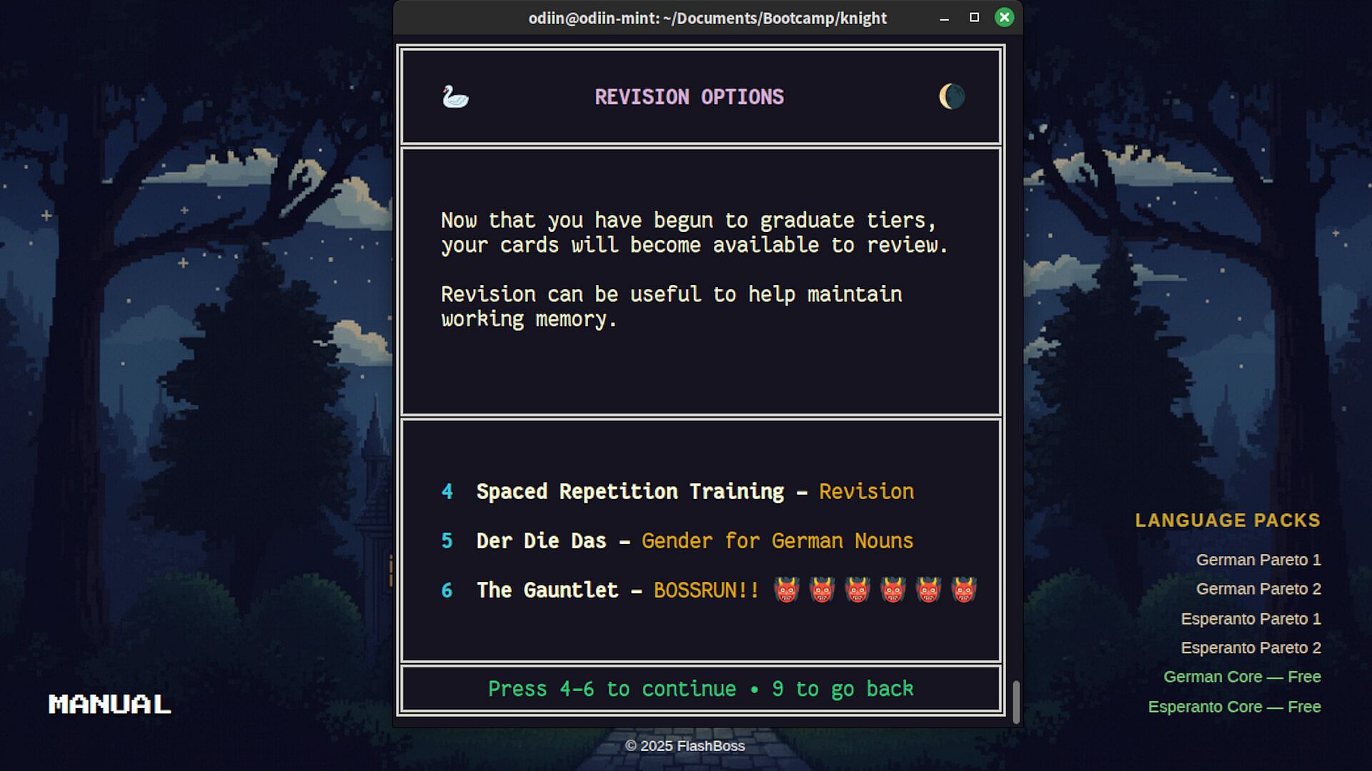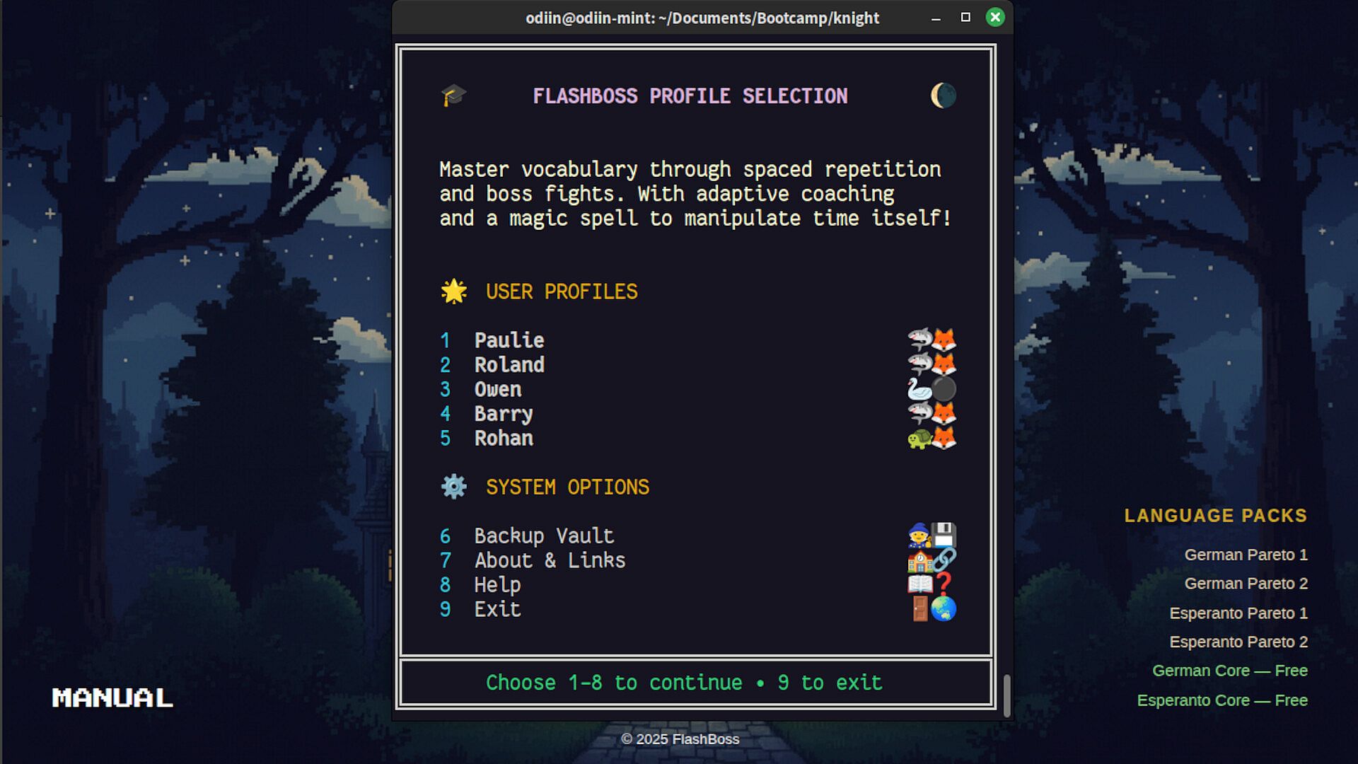 FlashBoss is a terminal-based vocabulary learning game that combines spaced repetition with RPG mechanics. Create a hero, choose a master to guide your journey, and battle through vocabulary clusters to achieve language mastery.