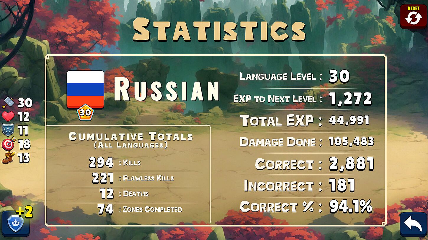 Progress through twelve cities featuring increasingly difficult enemies (and increasingly advanced vocabulary lists!) in your foreign language of choice: French, German, Spanish, Italian, Russian, Ukrainian, Japanese, Chinese (Simplified), Korean, Arabic, or Turkish.