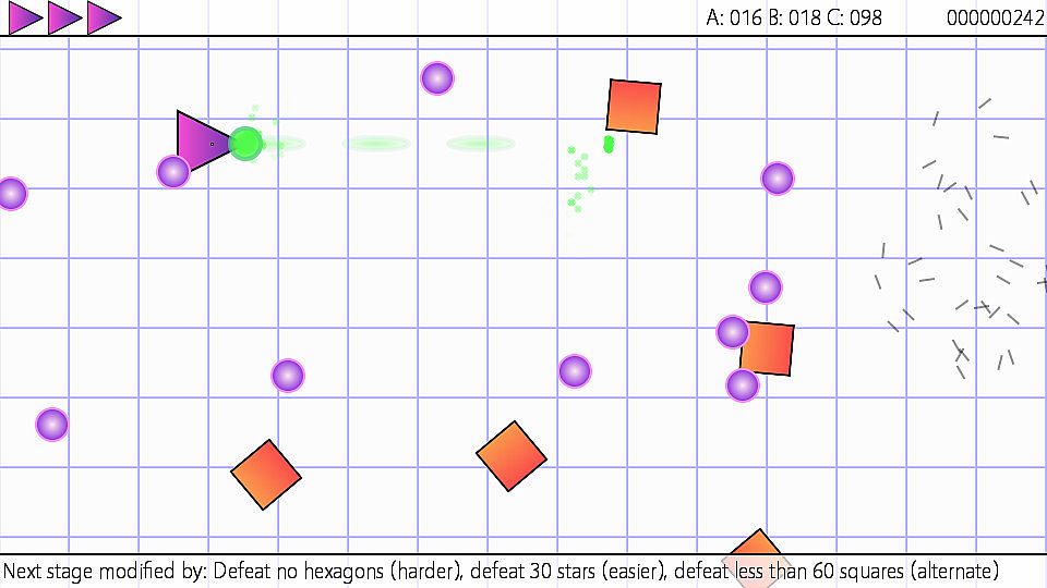 Experimental yet straightforward mechanics, engaging level design with varied gimmicks, and tons of gradients everywhere for era-authentic visuals are built both to make for a good, easy to play but hard to master shoot 'em up and to remind of browser games of days gone by.