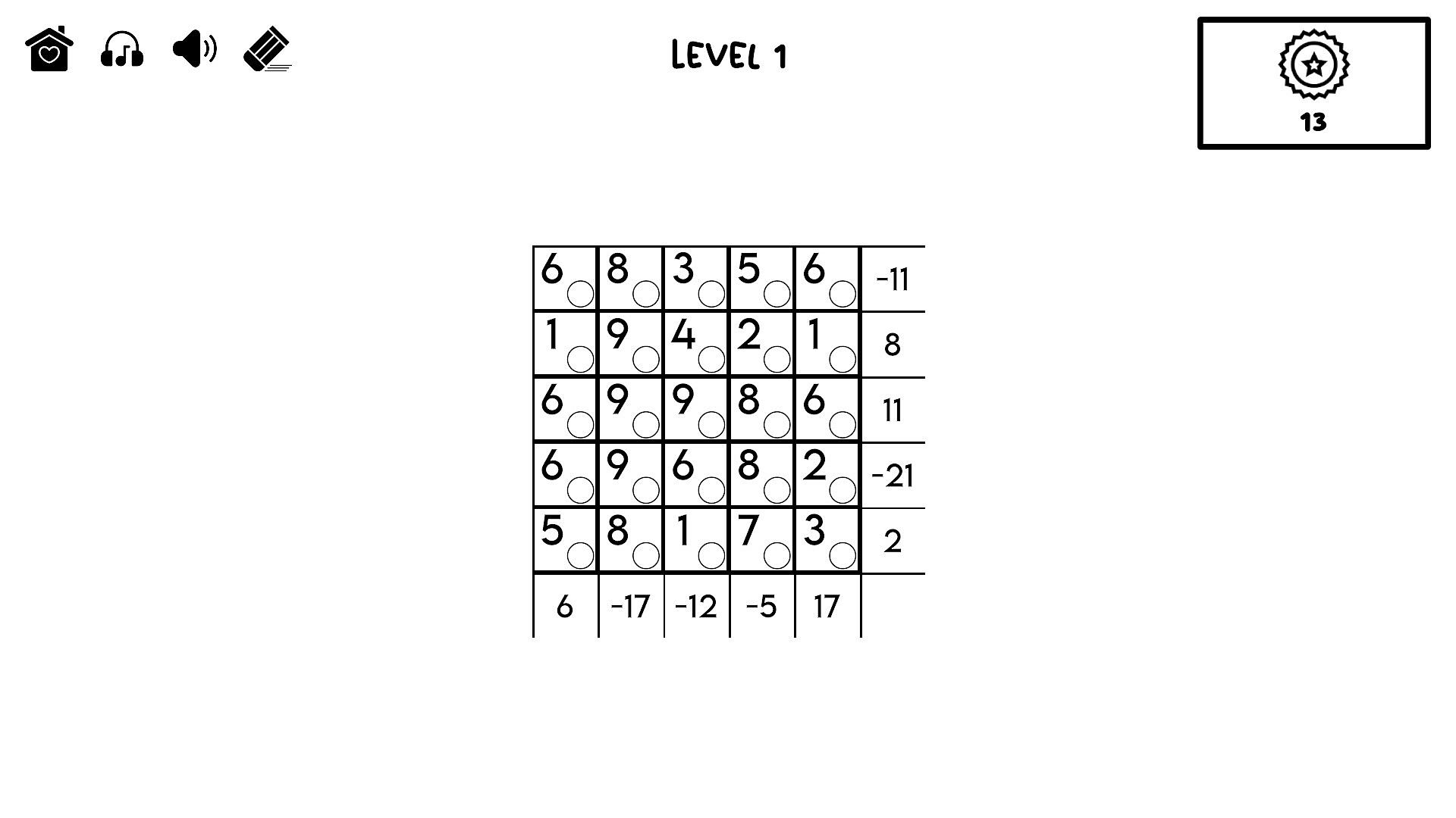 Mark numbers as positive, negative, or cancel them out. Only one number may be cancelled per row / column. Can you balance the entire grid so that each column / row adds up to the correct number?