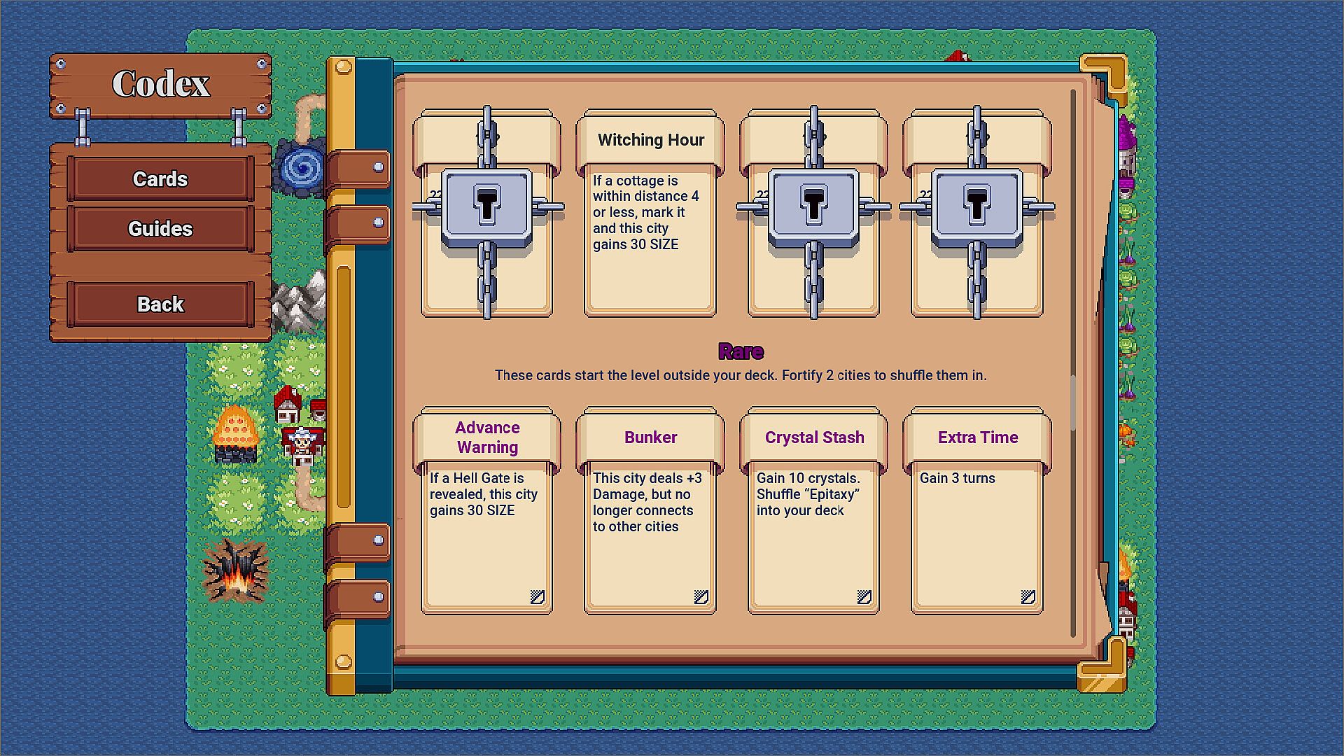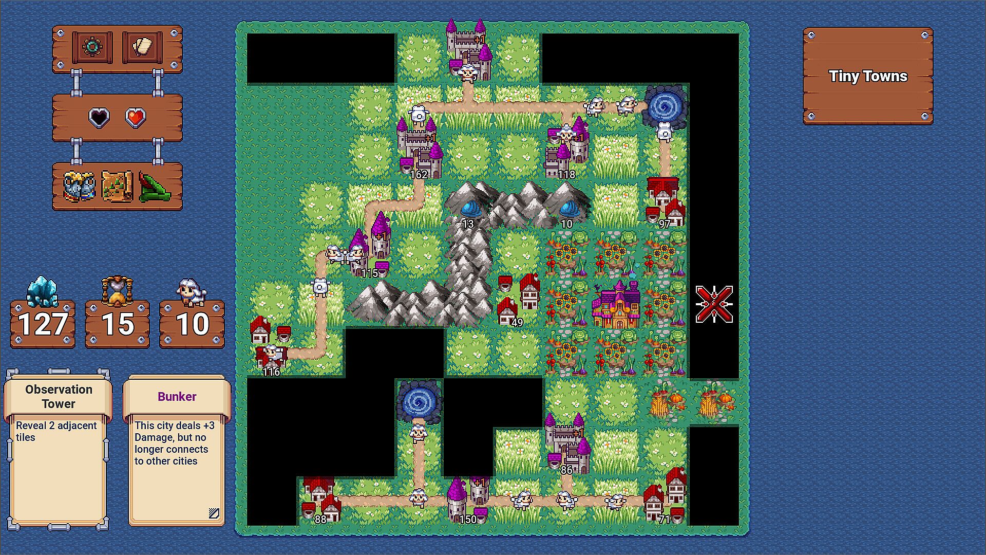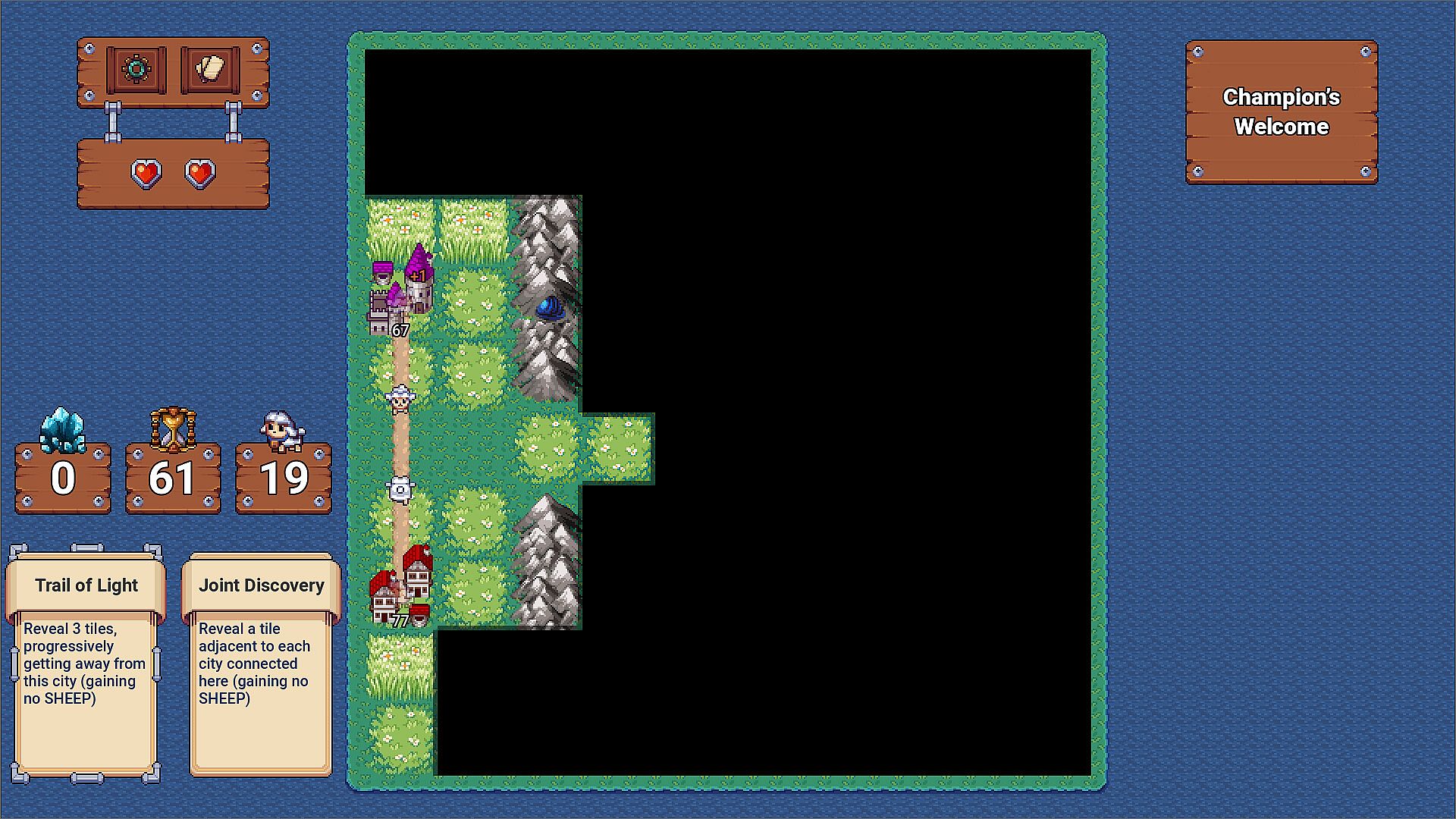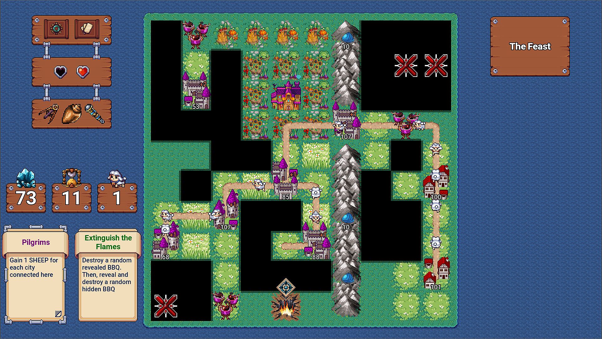 Explore the fog to uncover resources, find and connect cities, and play powerful cards. When you run out of turns, the demons invade and you watch as your defenses are put to the test. Win by defeating all the demons with at least one city standing. Fail, and the pastures will fall to the infernal forces.