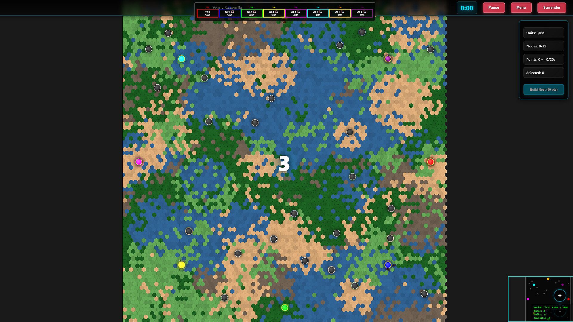 - Strategic gameplay with 32 nodes to control, terrain advantages, and structures such as Nests, Dens, and Hives.