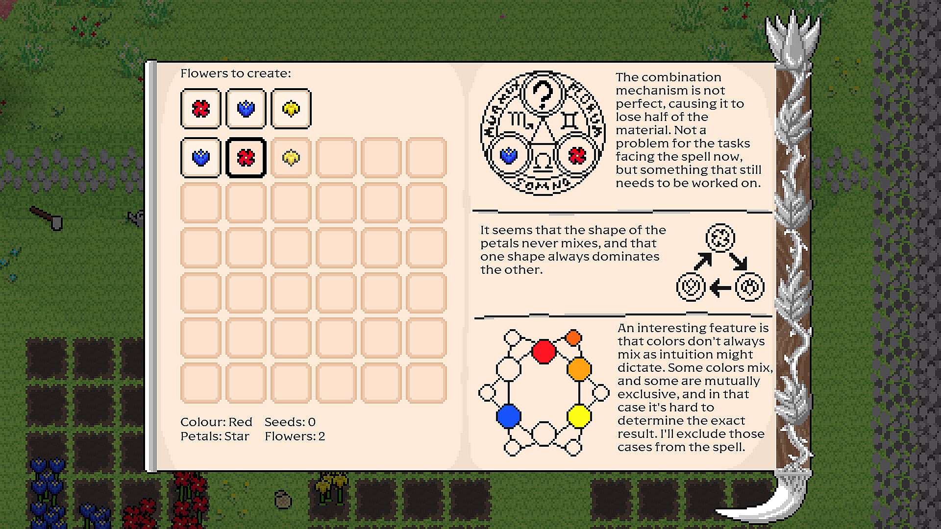 • Flower crafting. Combine flowers using a spell scroll to create new ones. Learn how colors mix and how petal shapes are inherited to grow exactly the flowers the Witch desires.