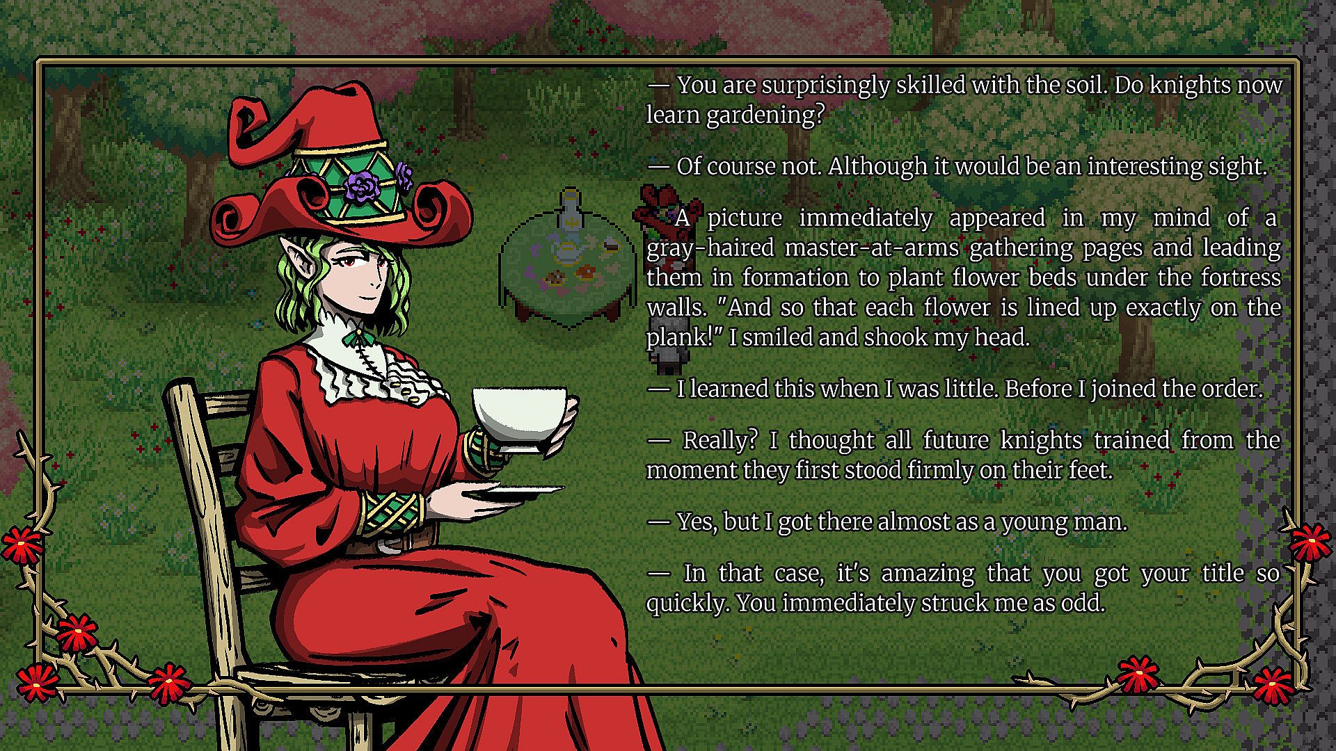 • Story game mode (kinetic visual novel-style narrative). A lone, wandering knight stumbles into a strange dream realm, where he meets a solitary Witch. Offered a moment of rest, the intrigued knight decides to stay for a while. As they chat and play a magical game over tea, they slowly learn about each other, and the Witch recounts a calamity that struck this part of the land a long time ago.