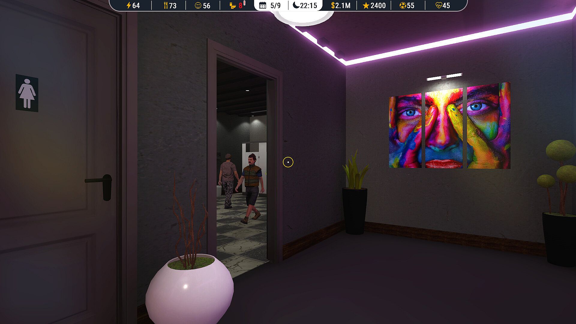 Bar: Socialize with other characters by going on bar outings, build relationships, and boost your morale.