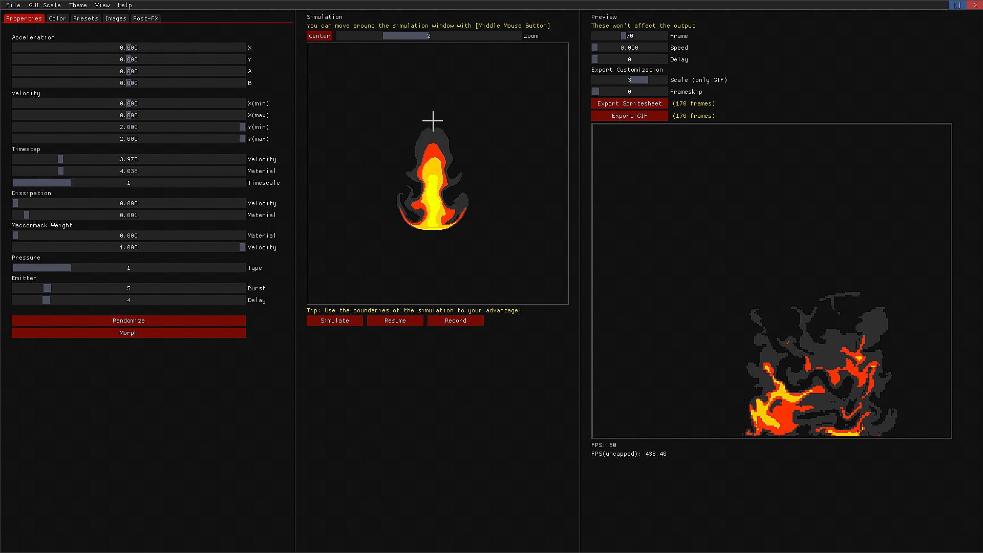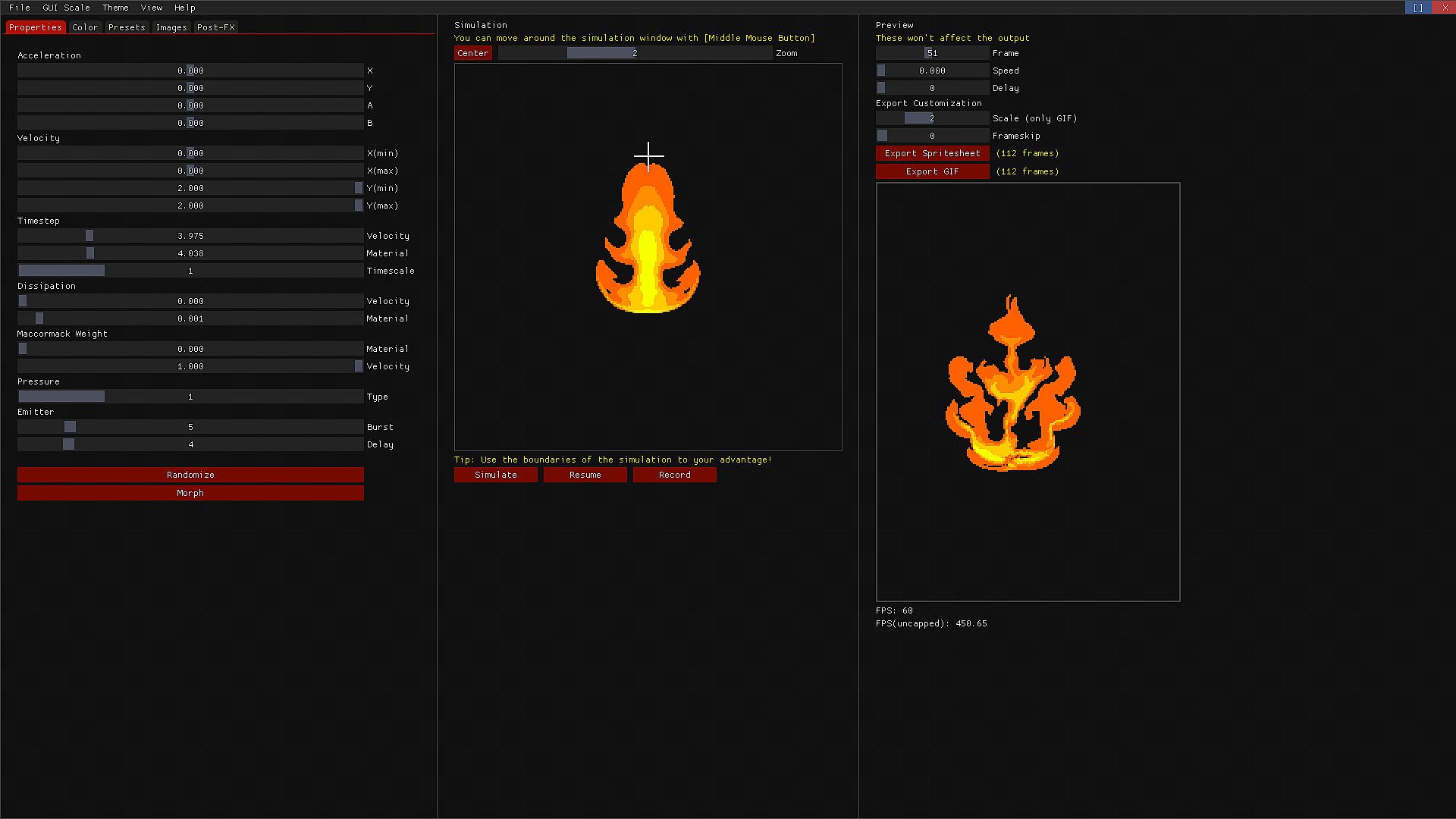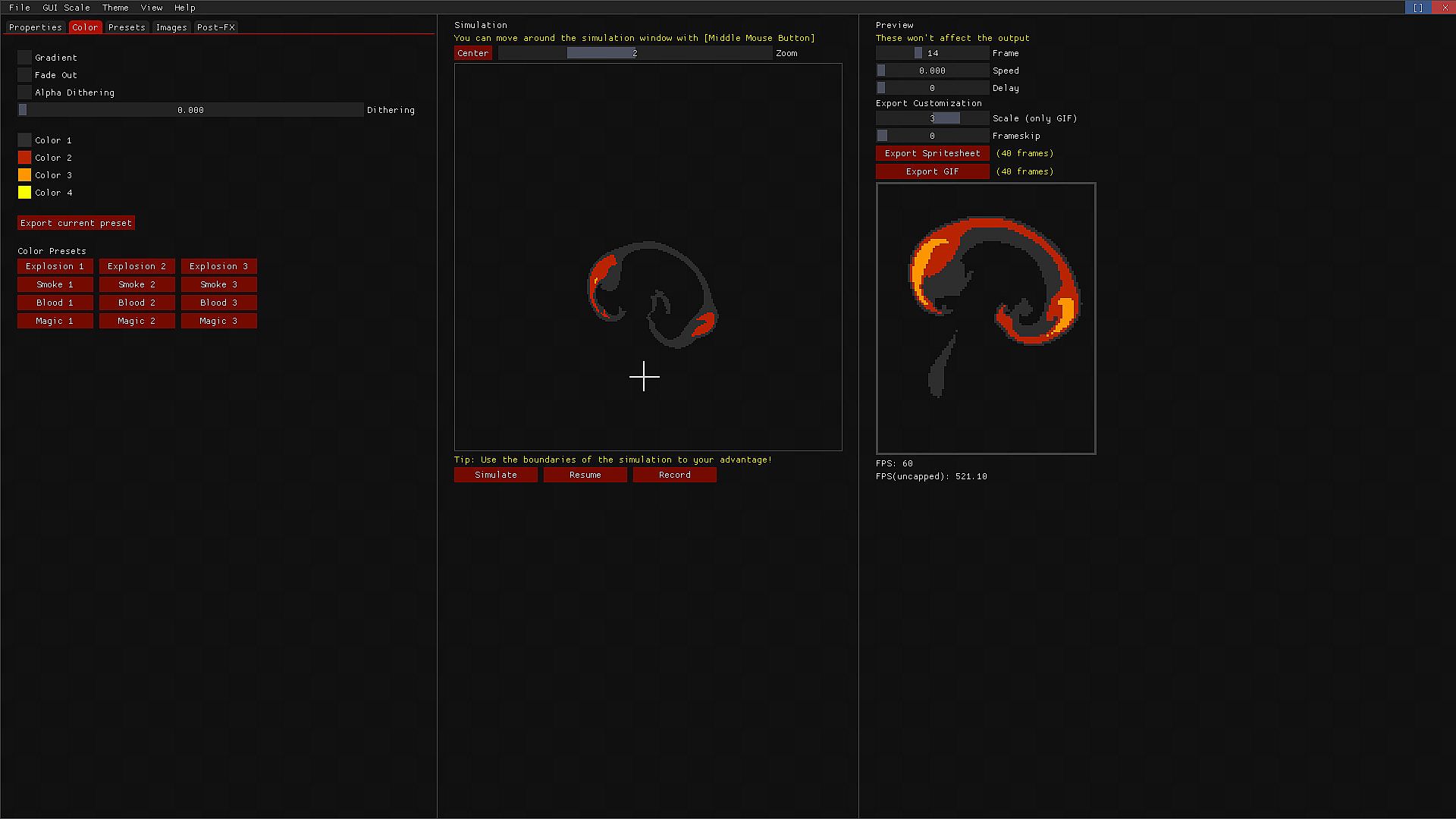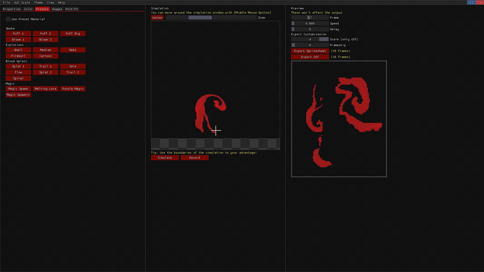 Fluid FX is a tool that relies on a fluid/pressure simulation to achieve different kind of animations like explosions, blood, smoke, dust, magic effects,etc..You can easily get cool animations with the included presets, and tweaking their values. After you get the result you want, you can export it directly into a spritesheet and import it into your game.