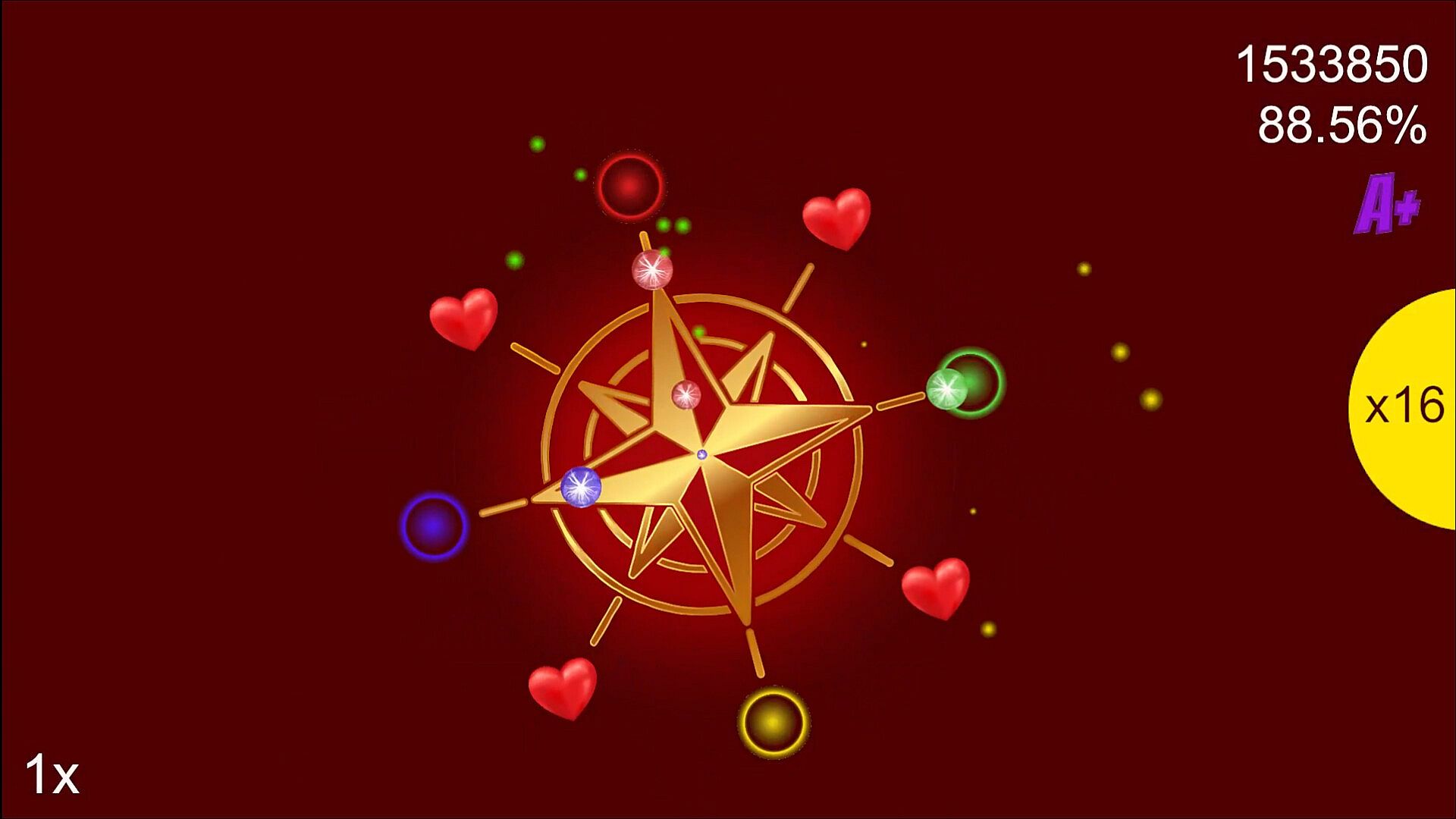Notes fly from the center towards the four directions: North, South, East, and West. Click in the correct direction when they approach.