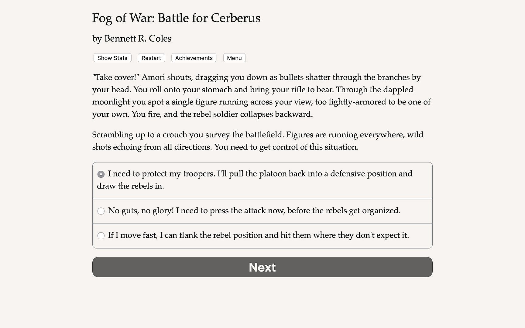 Fog of War: The Battle for Cerberus is a 170,000-word military sci-fi interactive novel by Bennett R. Coles, where your choices control the story, based in the universe of the award-winning Virtues of War novels. It's entirely text-based, without graphics or sound effects, and fueled by the vast, unstoppable power of your imagination.