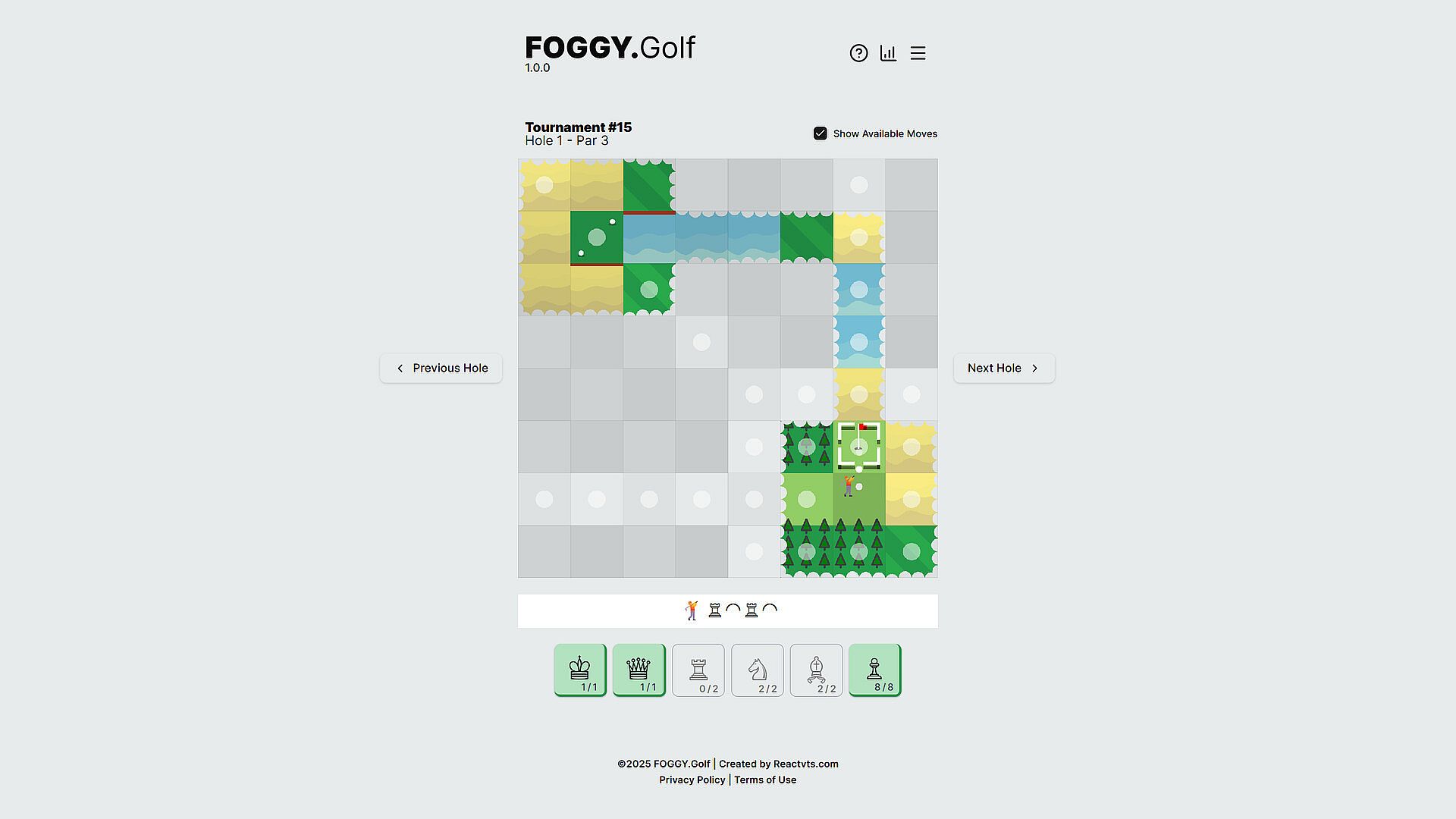 Use chess pieces as golf clubs to try and find the hole in a fog-covered golf course. But watch out for hazards like bunkers or water. Can you stay under par?