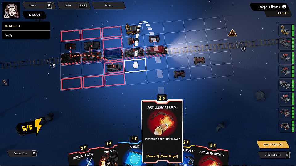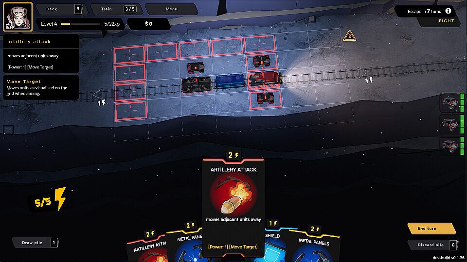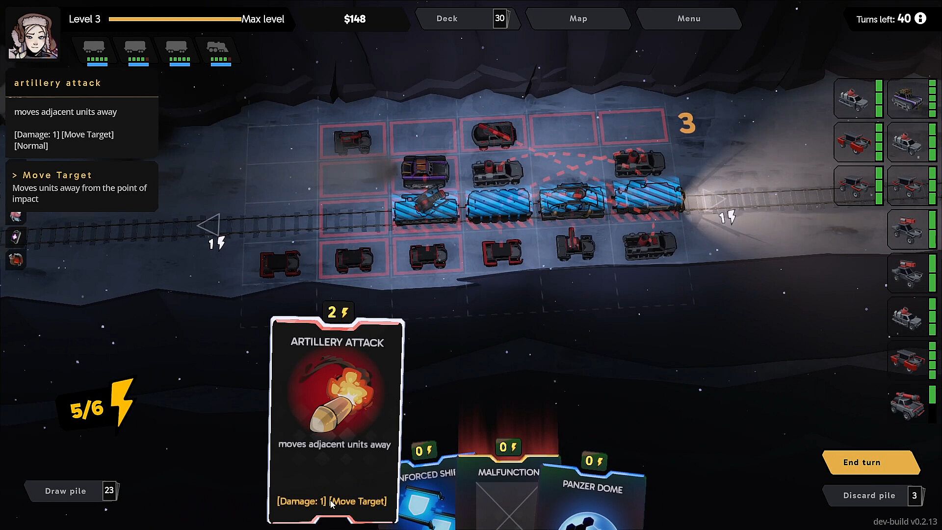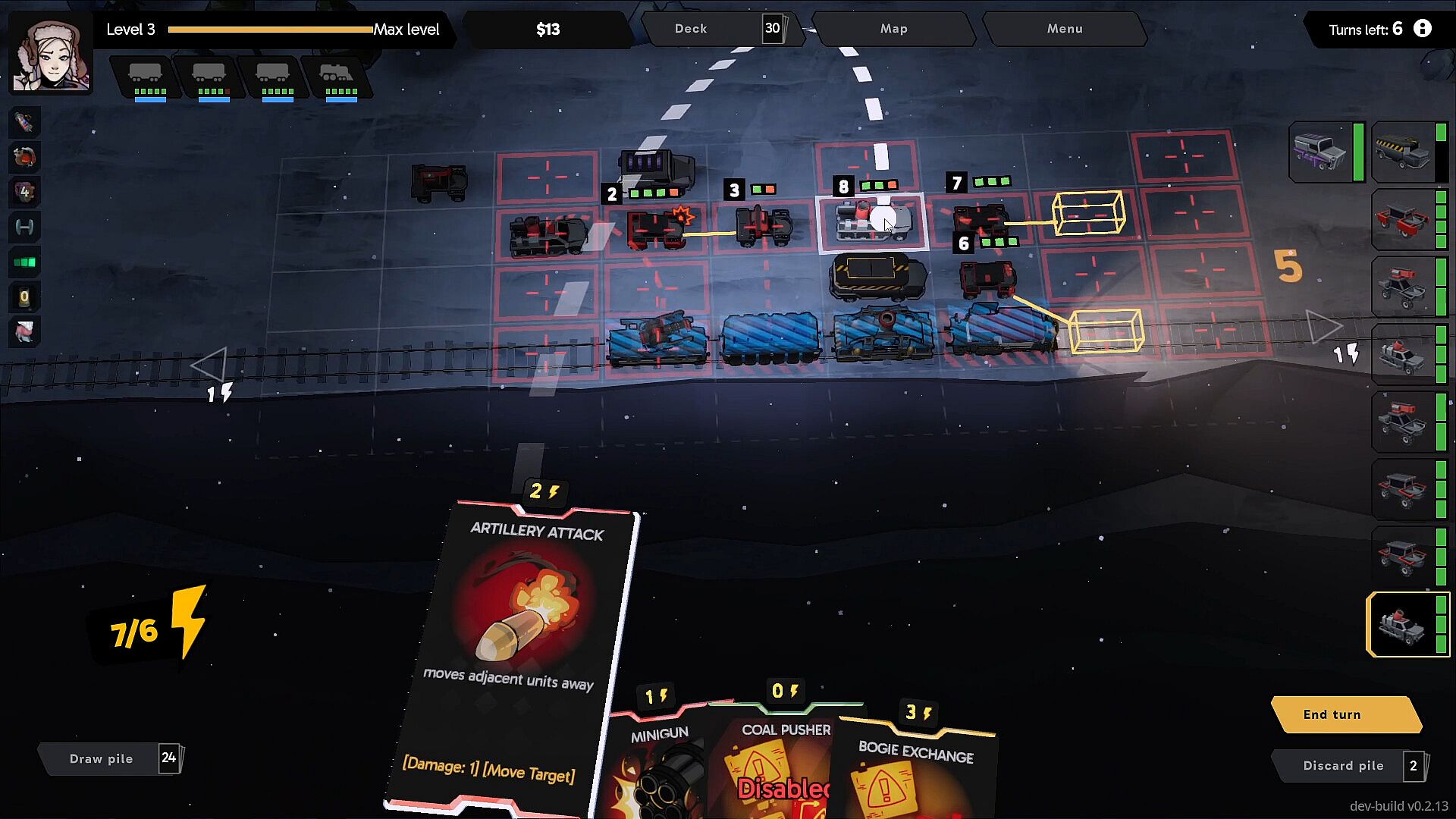 With only a limited number of action points to use per turn, meticulous planning and careful execution will level the playing field as you face an enemy that constantly outnumbers and surrounds you. Force the enemy into the path of oncoming environmental dangers, push them off cliffs and into each other, or trick them into attacking one another as they telegraph their moves so you can plan yours. A clever use of Coal combined with a well placed Artillery Shot can force an enemy onto the tracks in front of you, only to be immediately crushed under your wheels. That same Artillery Shot could be used to destroy a leading vehicle and send it tumbling backwards to damage (and possibly destroy) everyone driving behind it, potentially paired with hacking cards that give you a chance to line more vehicles up first. The right order of operations will allow you to devastate the enemy convoys.