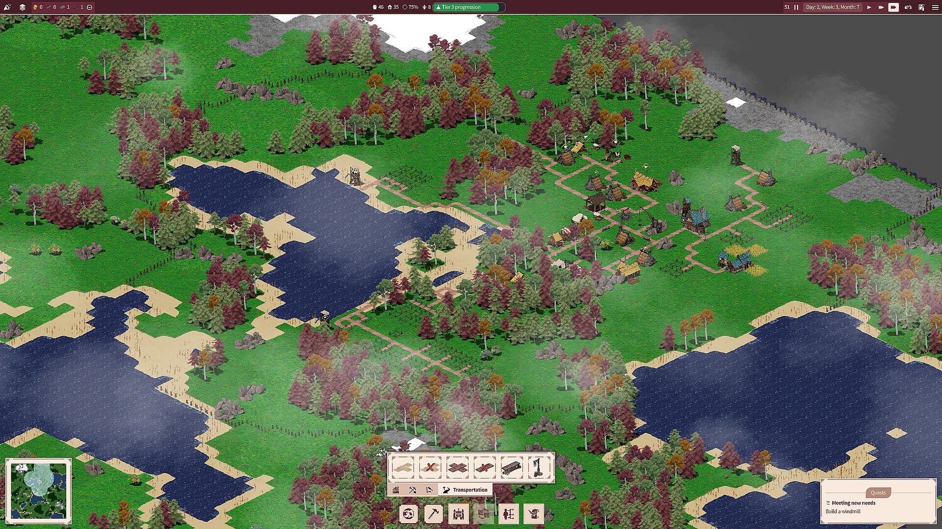 Build up and manage a settlement and care for your folks in this relaxing settlement builder with simulated citizens. You will need to provide shelter, guarantee a steady supply of food, resources and products, protect against the threats of nature. All the while paying attention to their well-being, to ensure your folks are happy, employed and safe.
