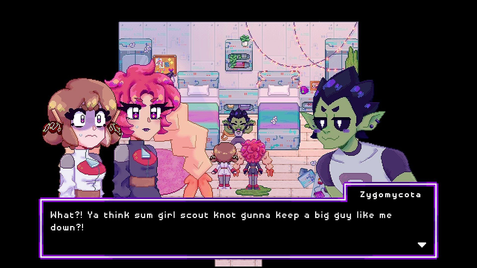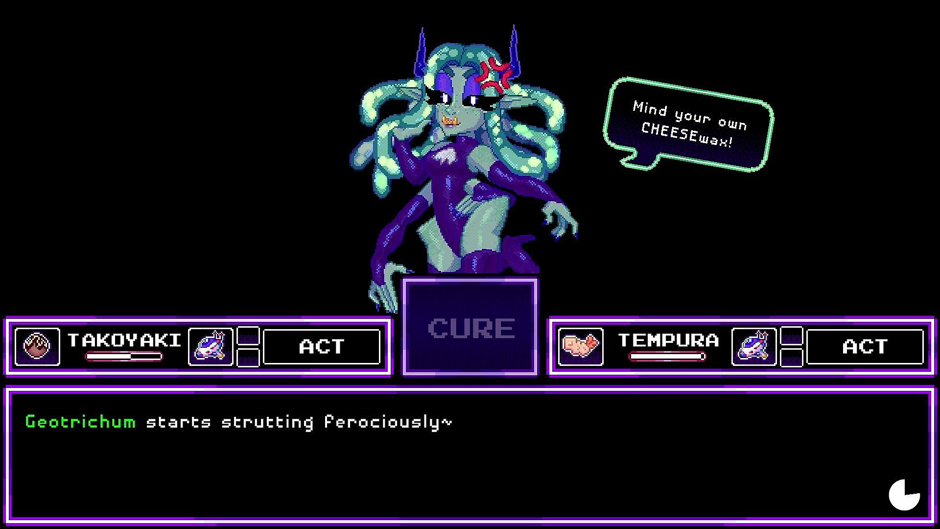 Engage in sci-fi turn-based combat against elusive Mold Enemies! All they want is to infect, spread, and grow! You HAVE to get rid of them… but maybe killing isn’t the answer? Maybe… the answer is… Food Puns? In a unique Battle Mechanic?