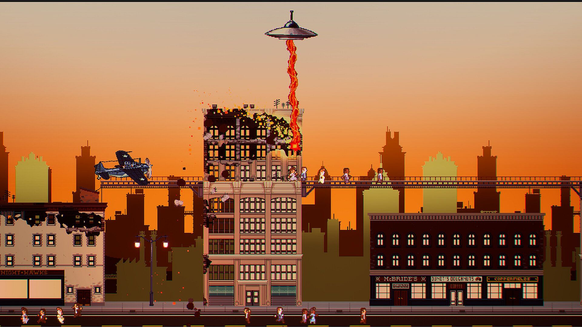 Take flight through the foggy spot-lit skies of 1950s B-movie Americana in this interstellar arcade action romp!
