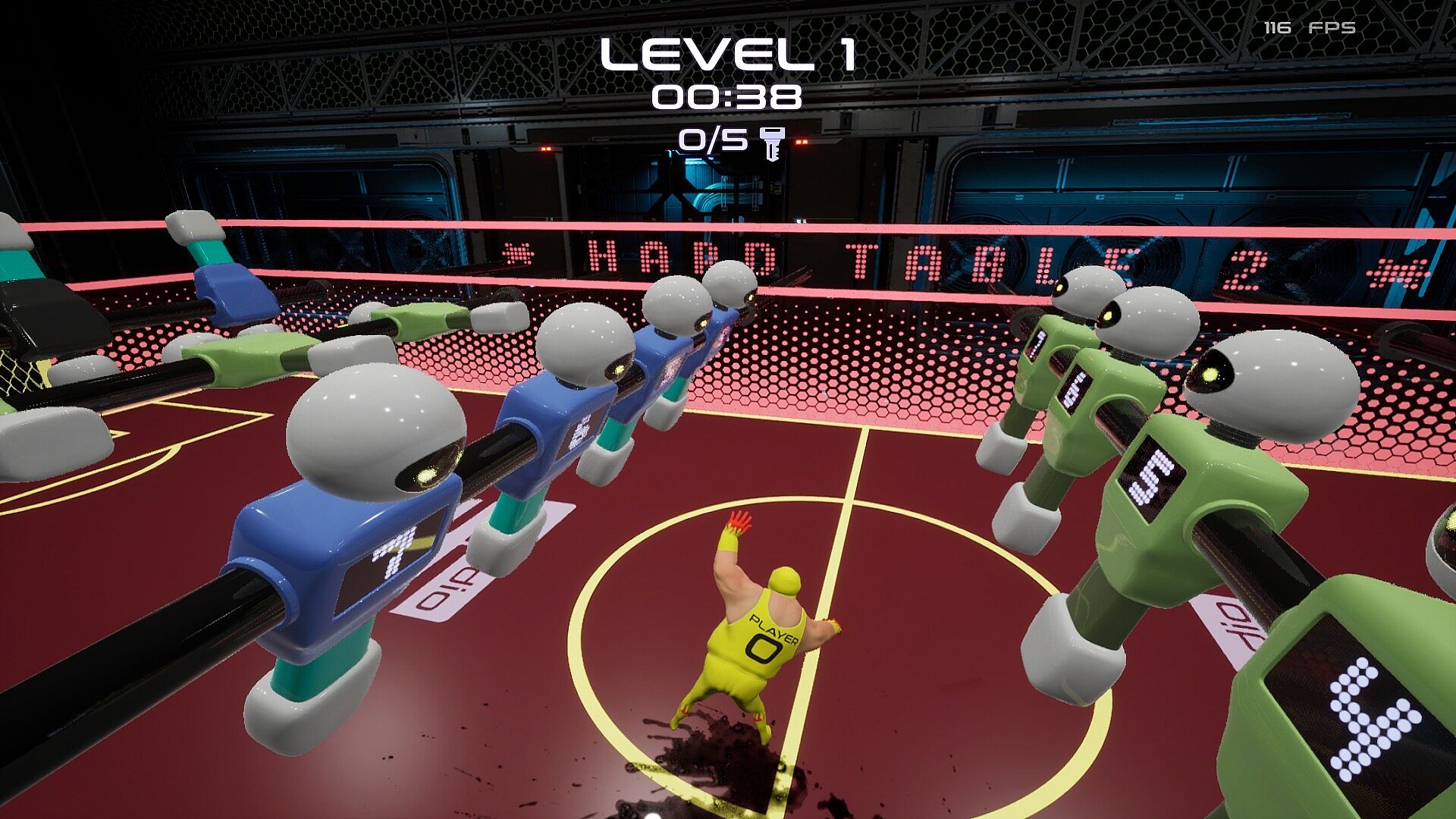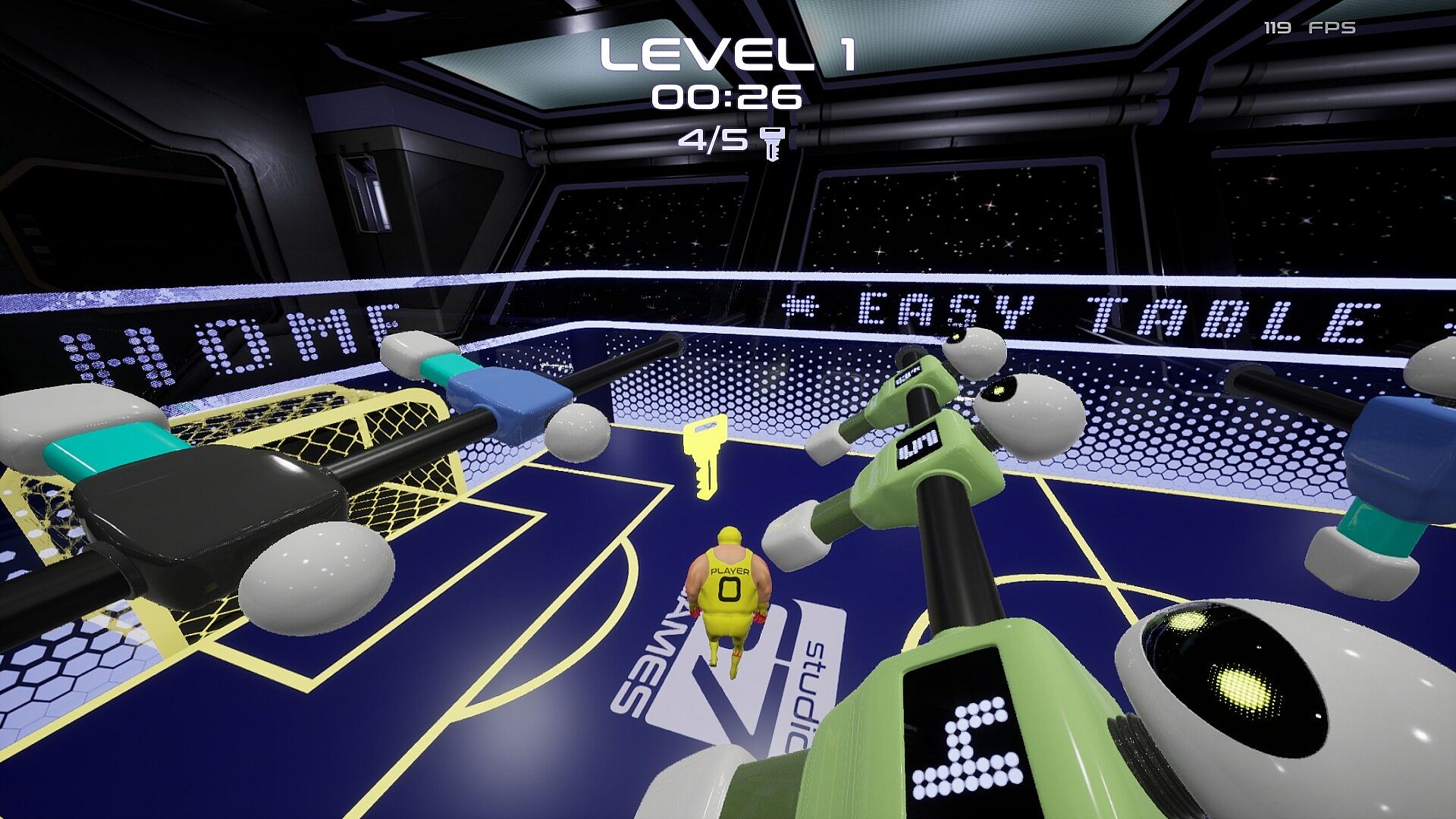 Experience the excitement of controlling a rotund footballer as you sprint through vibrant, futuristic tables. Your mission: collect five visible keys scattered across the table within one minute. As you dash around, avoid the spinning figures that get faster and hit harder with each level. Unlock the gate with the keys and roll in to score under a minute!