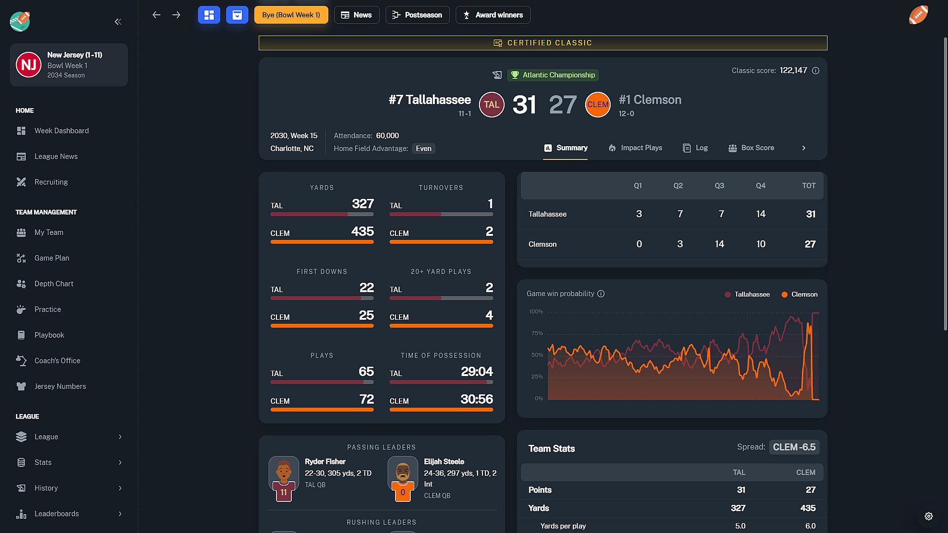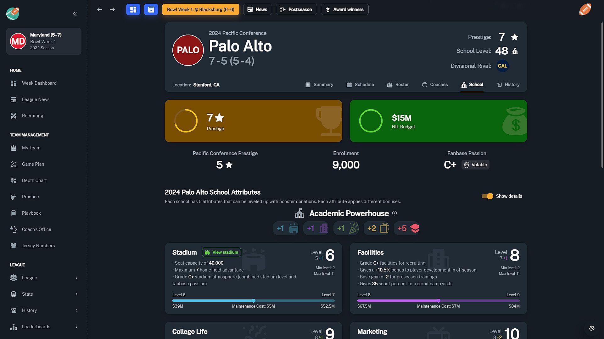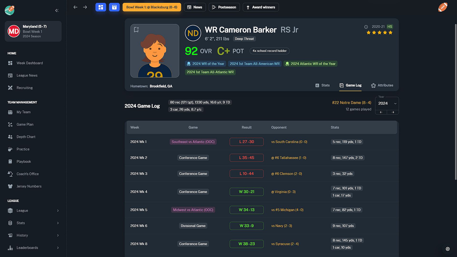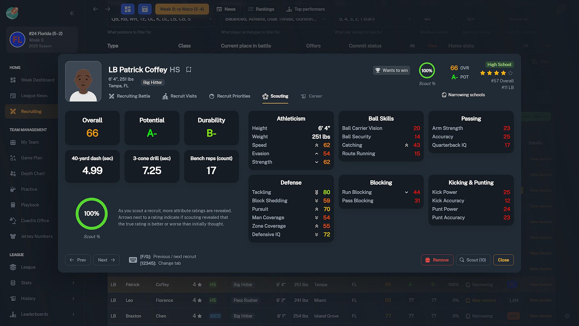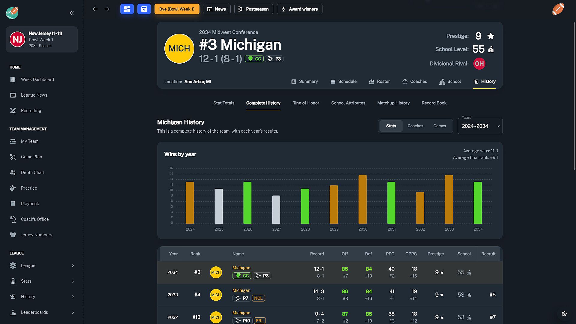 Scout and recruit players from all over the country, competing against other schools in tense recruiting battles. Pitch your team to recruits, schedule official visits, and even offer NIL deals.