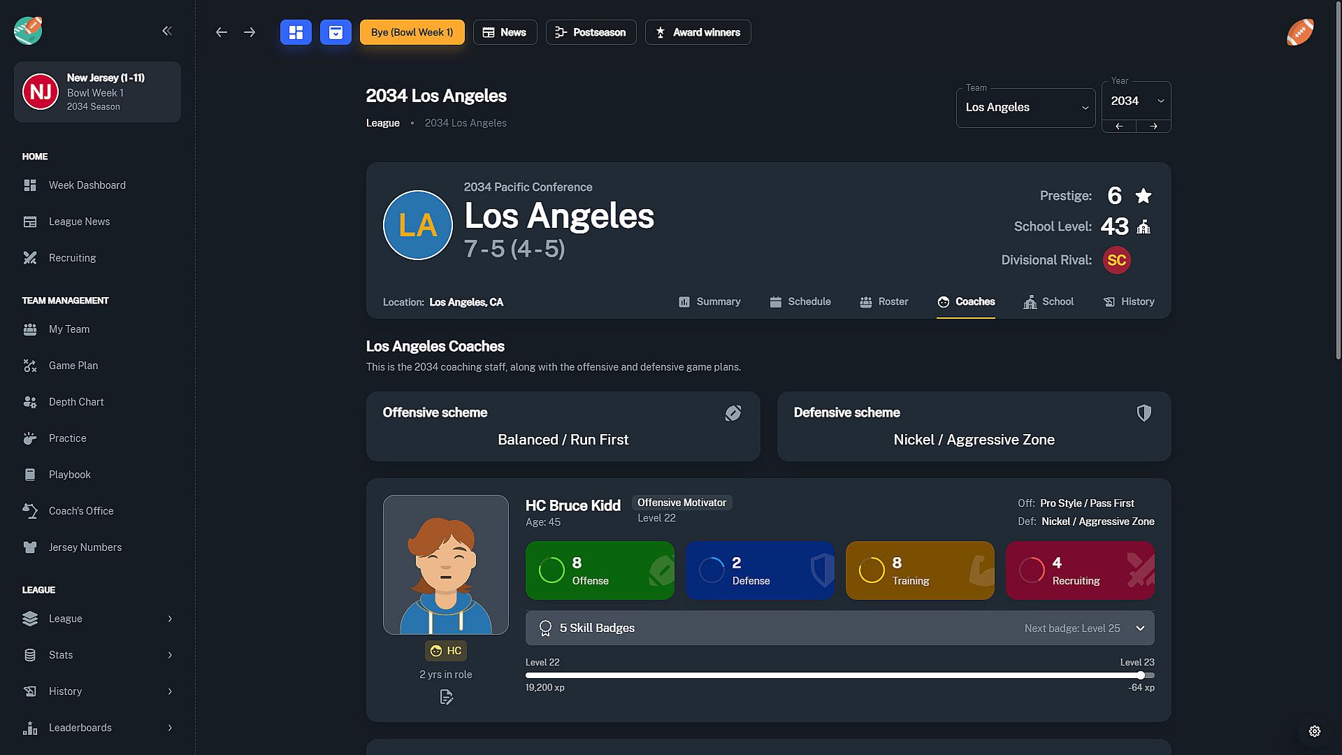 Earn XP to level your coach's offense, defense, training, and recruiting skills. Choose new skill badges throughout your career, each granting special bonuses to player performance, development, or recruitment.