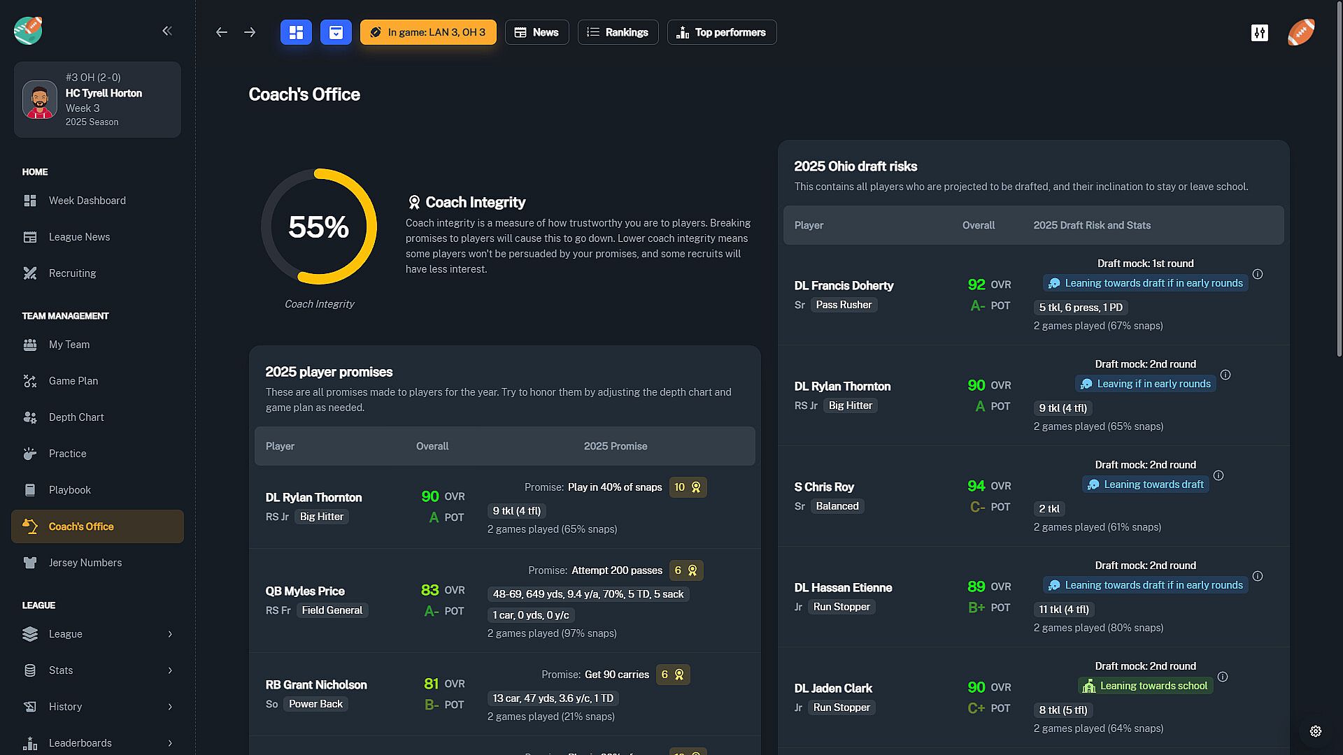In coach career mode, each school's athletic director will have expectations for you to meet. Exceeding them will make prestigious schools take notice, but missing expectations may result in losing your job.
