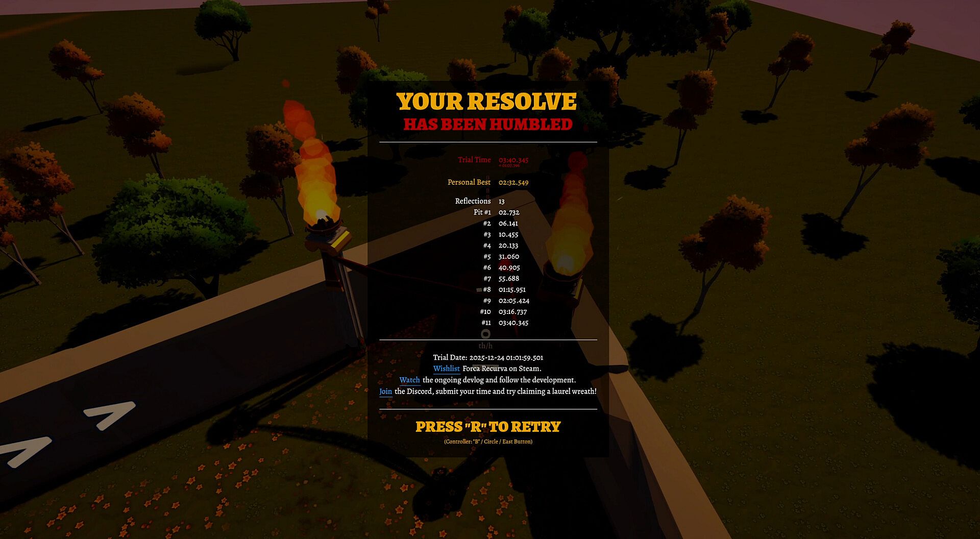 Forca Recurva is developed in the open. You can follow the entire process on YouTube​ — from first prototype to final release — and share your thoughts and personal best times on our Discord. Be part of the journey and play the prototype as the game evolves.​