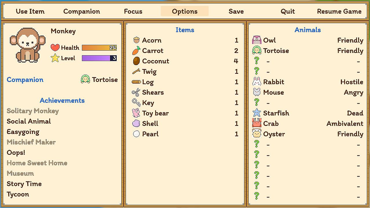 Guide a monkey through a forest in search of a fallen star in this indie adventure game. Encounter amusing characters and the occasional foe that either aid or block your path. Pick one of three companions like an owl or tortoise to unlock fresh options, or venture alone. Collect items to restore health, tackle obstacles, or spruce up your home while gaining experience to earn new abilities through leveling. Your decisions shape multiple paths and lead to one of four endings. Perfect for players seeking a quick 20-30 minute session packed with choice-driven exploration on PC.